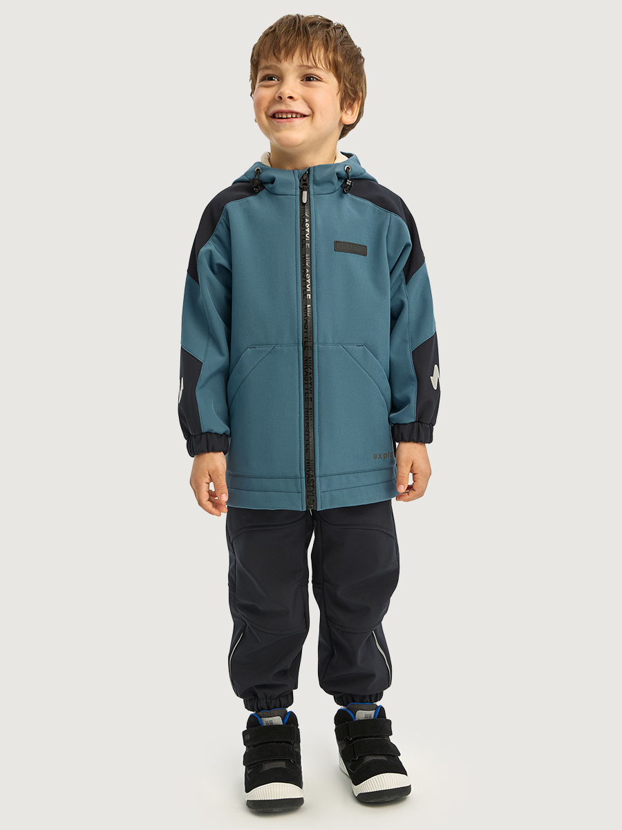 Ветровка для мальчика СКАЙЛАЙН из Softshell идеально подходит активным детям на прогулках, которые много двигаются и не сидят на месте. Softshell - это инновационный материал нового поколения, внешний слой которого защищает от влаги и ветра, внутренний слой из флиса сохраняет тепло и отводит лишнюю влагу, а промежуточный мембранный слой имеет хорошую паропроницаемость и позволяет коже дышать. Softshell приятный на ощупь, легкий и эластичный материал, не сковывающий движения ребенка.