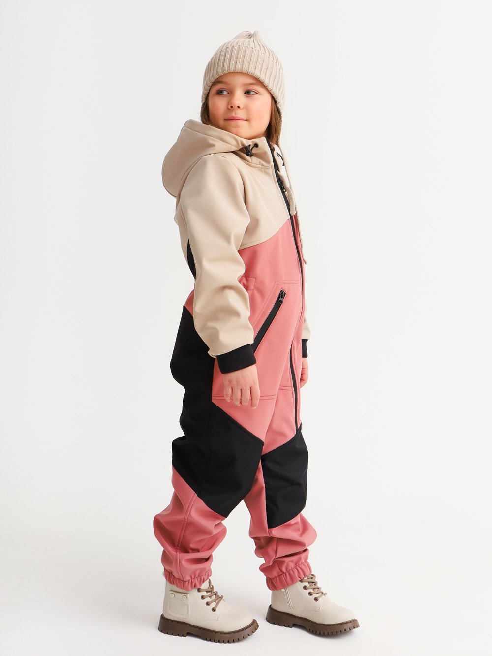Комбинезон из высокотехнологичной трехслойной "дышащей" ткани - софтшелл, с застежкой на влагозащитную молнию, кулисой с утяжкой по талии и усиленными прочной тканью коленями. Капюшон с цельнокроеной стойкой и утяжкой, мягкие манжеты на ножках и ручках, дополнительные световозвращающие элементы для безопасности в темное время суток.