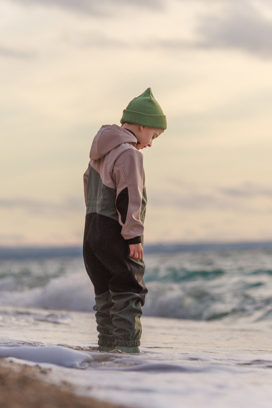 Комбинезон из высокотехнологичной трехслойной "дышащей" ткани - софтшелл, с застежкой на влагозащитную молнию, кулисой с утяжкой по талии и усиленными прочной тканью коленями. Капюшон с цельнокроеной стойкой и утяжкой, мягкие манжеты на ножках и ручках, дополнительные световозвращающие элементы для безопасности в темное время суток.