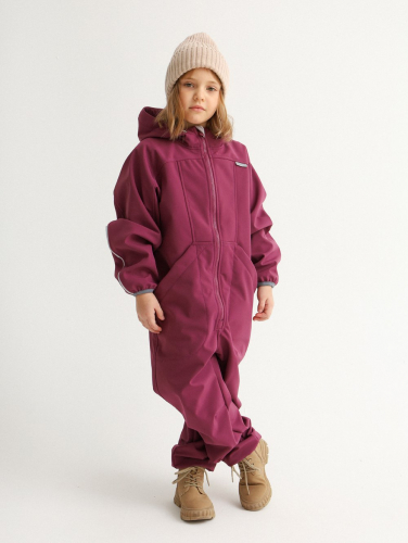 Комбинезон из высокотехнологичной трехслойной "дышащей" ткани - софтшелл с фирменными гребнями Дино на капюшоне. Рукава-реглан, застежка на тракторную молнию с внутренним ветрозащитным клапаном, спинка с частичной утяжкой на резинку по талии. Два больших кармана спереди для хранения мелочей. Световозвращающие элементы для безопасности в темное время суток. Примерный температурный режим от -5°С до +18°С.