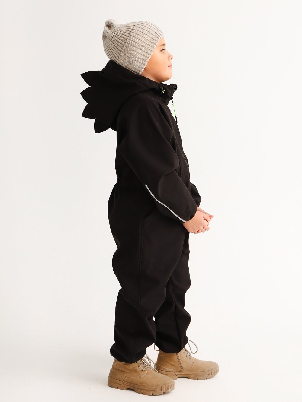 Комбинезон из высокотехнологичной трехслойной "дышащей" ткани - софтшелл с фирменными гребнями Дино на капюшоне. Рукава-реглан, застежка на тракторную молнию с внутренним ветрозащитным клапаном, спинка с частичной утяжкой на резинку по талии. Два больших кармана спереди для хранения мелочей. Световозвращающие элементы для безопасности в темное время суток. Примерный температурный режим от -5°С до +18°С.