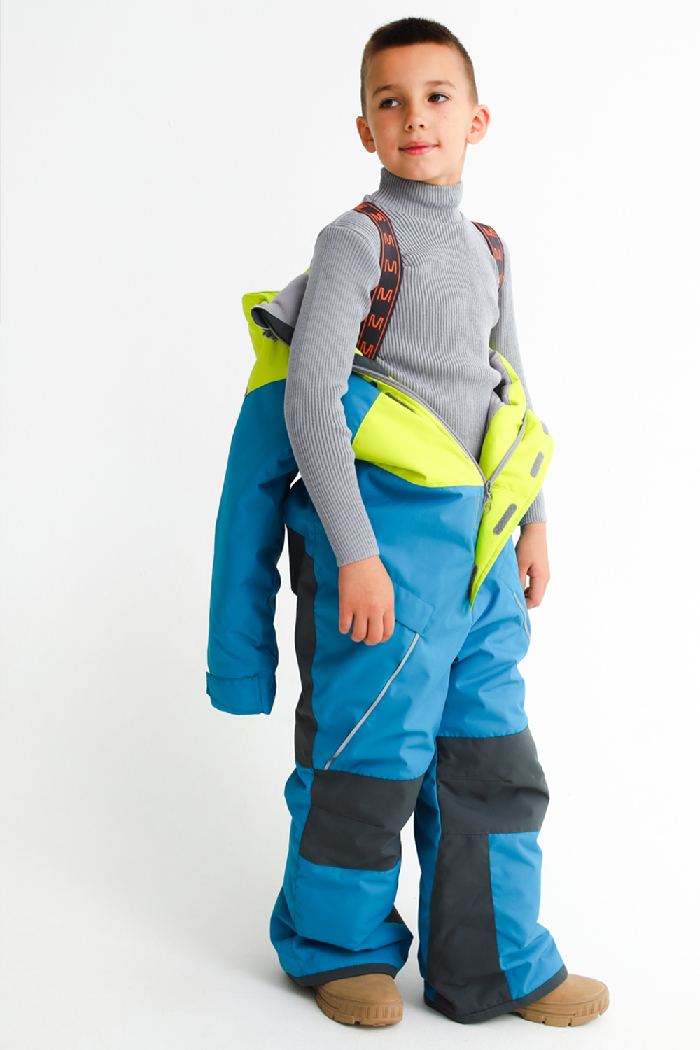 Мембранная ткань с высокими показателями для активного спорта. Съемный капюшон на кнопках с утяжками для защиты от ветра. Высокий воротник-стойка. Застежка на молнию с ветрозащитной планкой на липучках. Лямки-резинки (дают возможность легко скинуть верхнюю часть в помещении). Карманы по бокам и карман на молнии на левом рукаве. Усиление задней части, внутренней и нижний части штанин (беспрепятственно познаем мир). Внутренние манжеты штанин на антискользящих резинках. Рукава с патами и манжетами из бифлекса. Именная нашивка. Световозвращающие элементы (безопасность в любое время суток). Фирменные элементы MINIDINO. Примерный температурный режим от -7°С до -30°С.