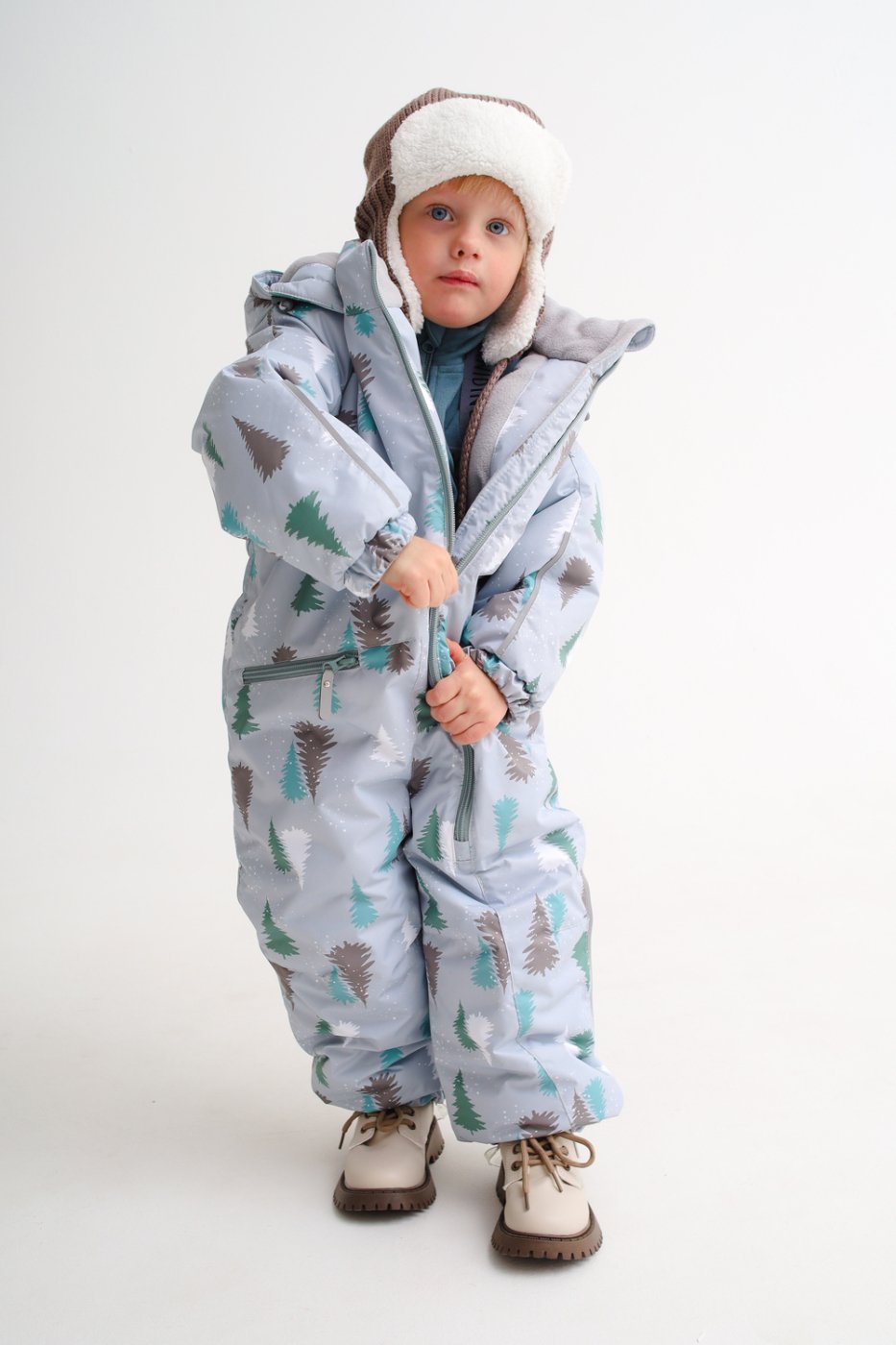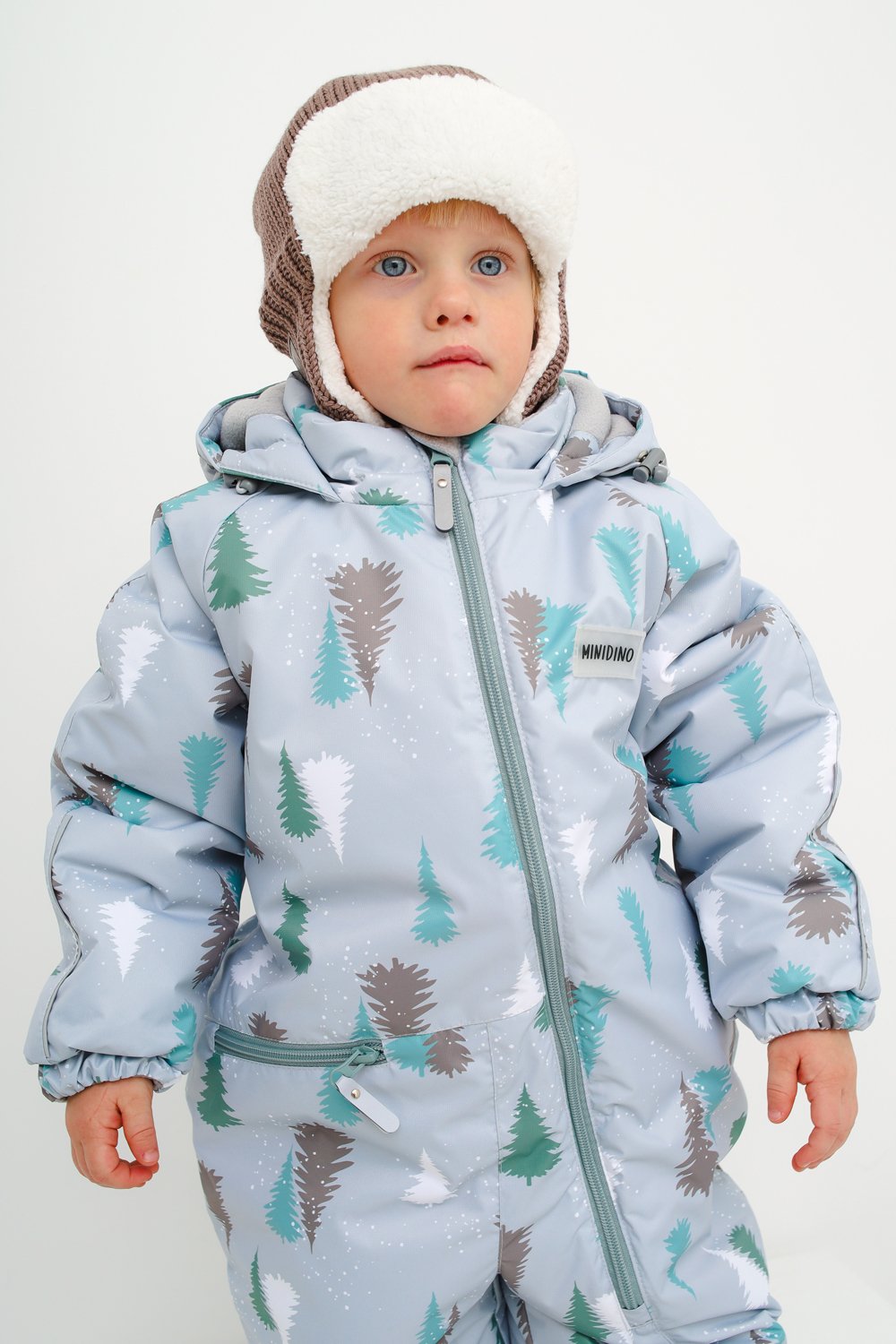 Комбинезон  зимний с наклонной застежкой на молнию. Внутренний ветрозащитный клапан с защитой подбородка от защемления. Рукав-реглан, низ рукава обработан манжетой на резинке.Спереди прорезной карман на молнии. По спинке кулиса с резинкой по талии. Низ брюк на противоскользящей резинке. Воротник-стойка, капюшон втачной с утяжкой на шляпную резину.  Лямки-помочи дают возможность легко скинуть верхнюю часть комбинезона в помещении. Световозвращающие элементы для безопасности в любое время суток. Фирменная брендированная нашивка Minidino.Примерный температурный режим от -5°С до -30°С.