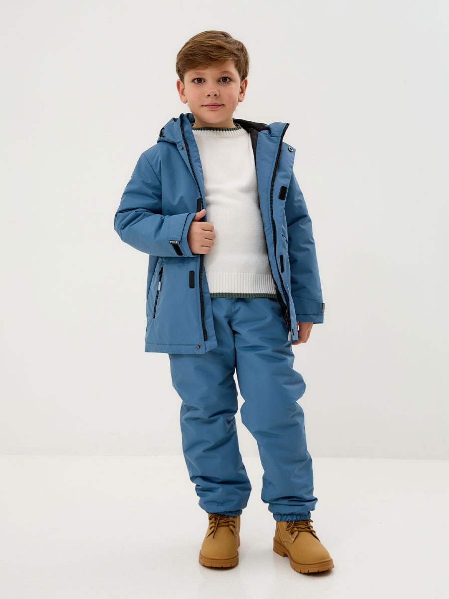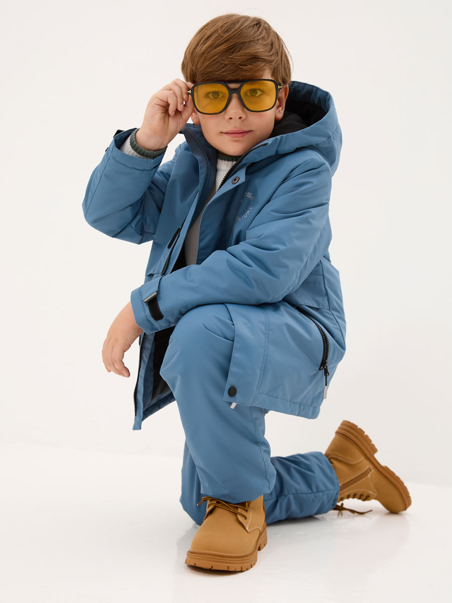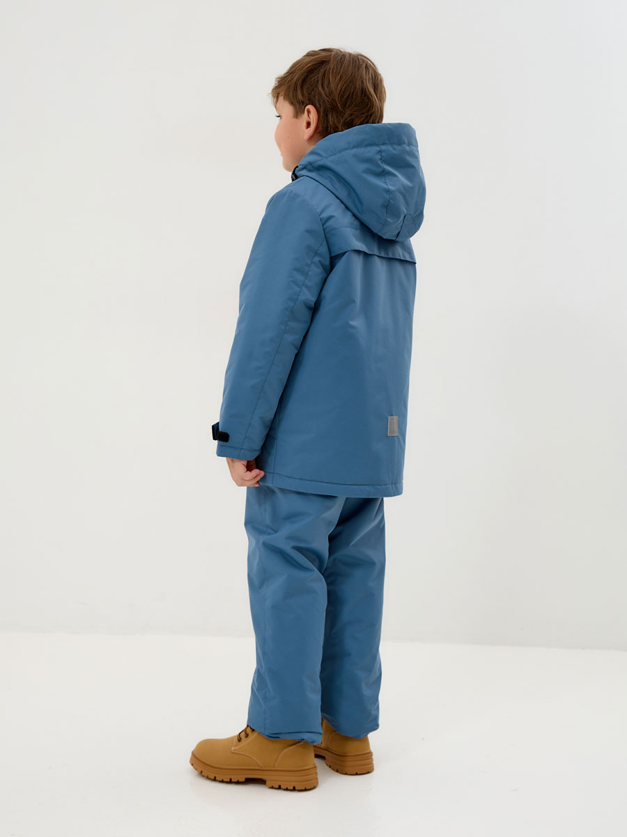 Куртка прямого силуэта, с втачным капюшоном. Центральная застёжка на молнию, закрыта центральной планкой на кнопках и липучках. По низу куртки кулиса с резиновым шнуром и фиксаторами для удобства прилегания. На полочках прорезные карманы с молниями. Низ рукавов прямой с патой на липучке. Внутренний капюшон из флиса с утеплителем. Подкладка комбинированная, настегана на утеплитель.
