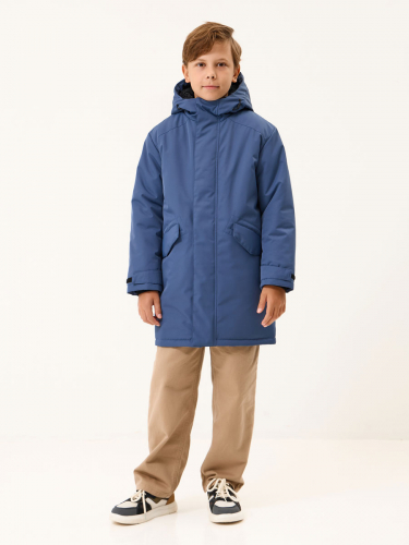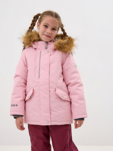 Куртка прямого силуэта, с втачным воротником-стойкой и отстёгивающимся капюшоном, с отстегивающейся опушкой из искусственного меха (енот). Застёжка на молнию, закрытая планкой на кнопках и липучках. 2 наружных кармана с клапаном на кнопке, 1 внутренний карман с липучкой. Подкладка из цветного флиса. В подкладке помочи из тесьмы для ношения куртки за плечами.
