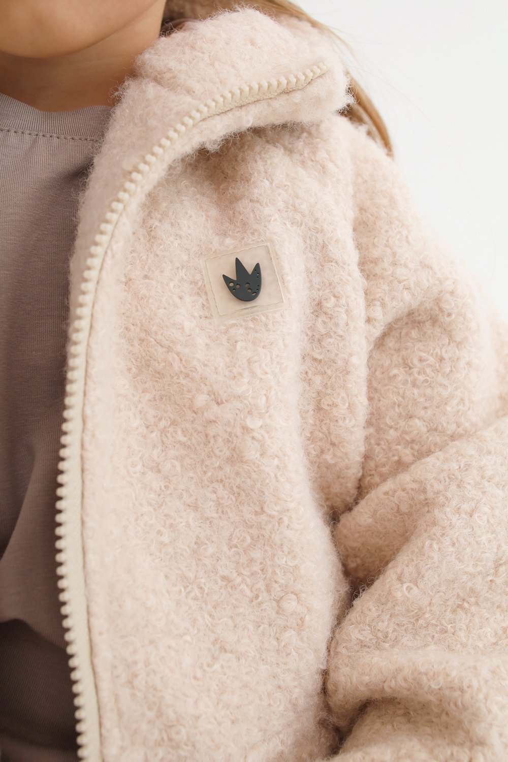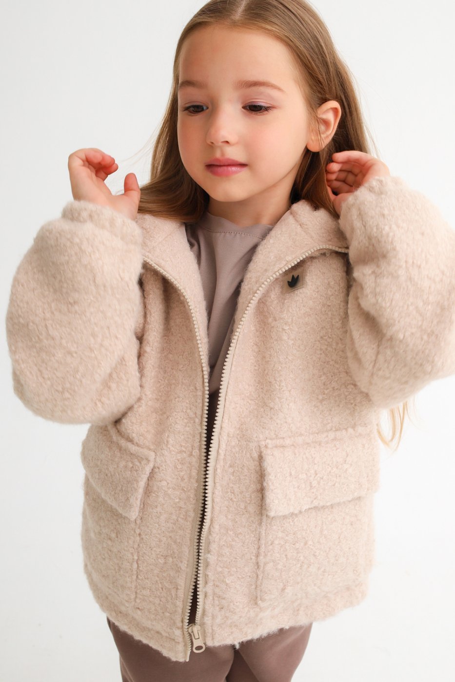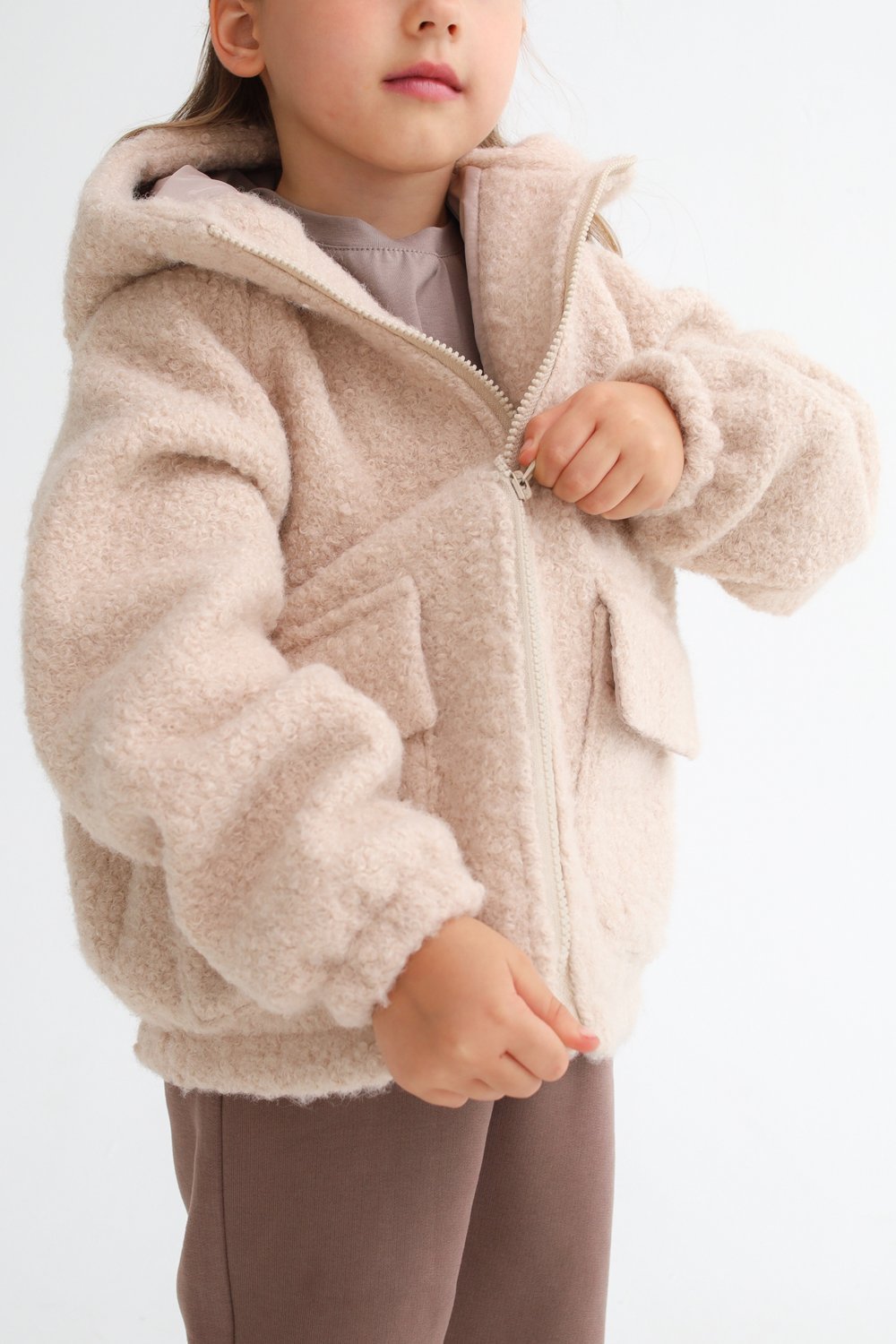 Легкая куртка из фактурной ткани букле с капюшоном и застежкой на молнию. Рукава-реглан с манжетами на резинке. Накладные карманы с клапанами спереди.