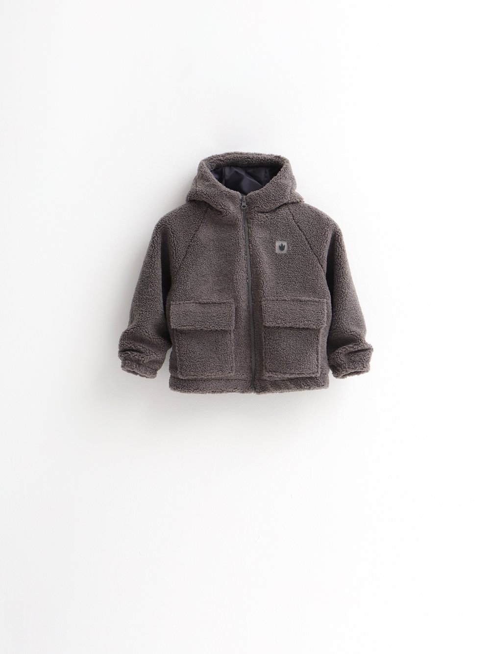 Легкая куртка из фактурной ткани букле с капюшоном и застежкой на молнию. Рукава-реглан с манжетами на резинке. Накладные карманы с клапанами спереди.