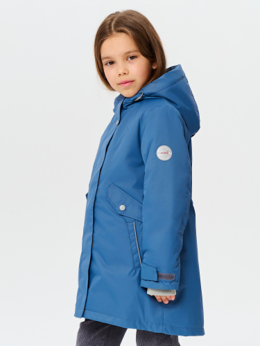 Куртка для девочек школьного возраста из мембранной ткани. Центральная молния закрыта планкой на липучках и кнопках. Комбинированная подкладка из цветного флиса и шелка с внутренним карманом на липучке. Втачной капюшон с подкладкой из цветного флиса. 2 передних кармана с клапаном на кнопке и 2 боковых кармана с листочкой. На куртке расположены светоотражающие элементы. Рассчитана на температуру от -5 до +10. флис, 100% полиэстер