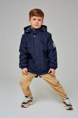 Куртка для мальчиков дошкольного возраста из мембранной ткани. Центральная молния закрыта планкой на липучках и кнопках. Комбинированная подкладка из цветного флиса и шелка с внутренним карманом на липучке. Съёмный капюшон с подкладкой из цветного флиса. 2 передних кармана с клапаном на кнопке. На куртке расположены светоотражающие элементы. Рассчитана на температуру от 0 до +10. флис, 100% полиэстер