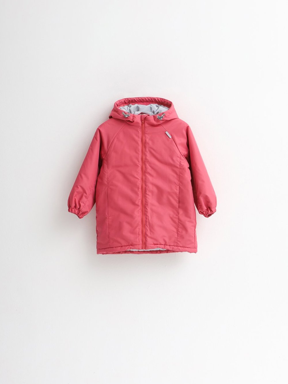 Куртка объемного силуэта «кокон» с рукавами-реглан с манжетами на резинке. Втачной капюшон с цельнокроеной стойкой и утяжкой, застежка на тракторную молнию с внутренним ветрозащитным клапаном. Карманы в швах рельефов по переду, утяжка по низу изделия. Световозвращающие элементы для безопасности в темное время суток.