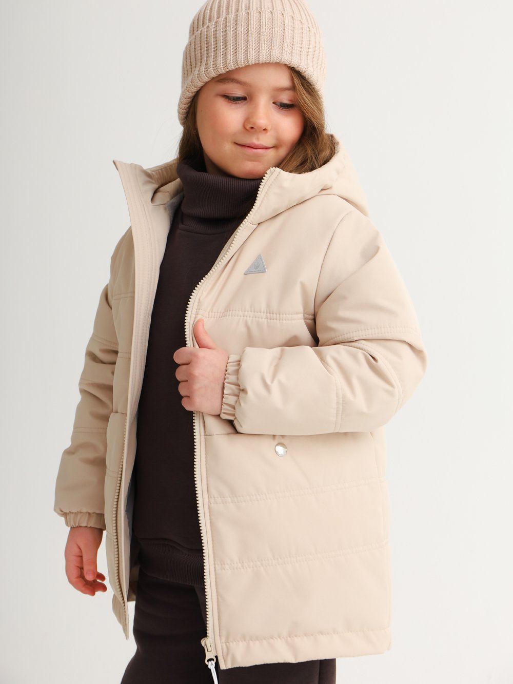 Куртка с застежкой на тракторную молнию с внутренним ветрозащитным клапаном и втачным капюшоном с цельнокроеным воротником-стойкой. Вместительные карманы с застежкой на кнопки спереди.