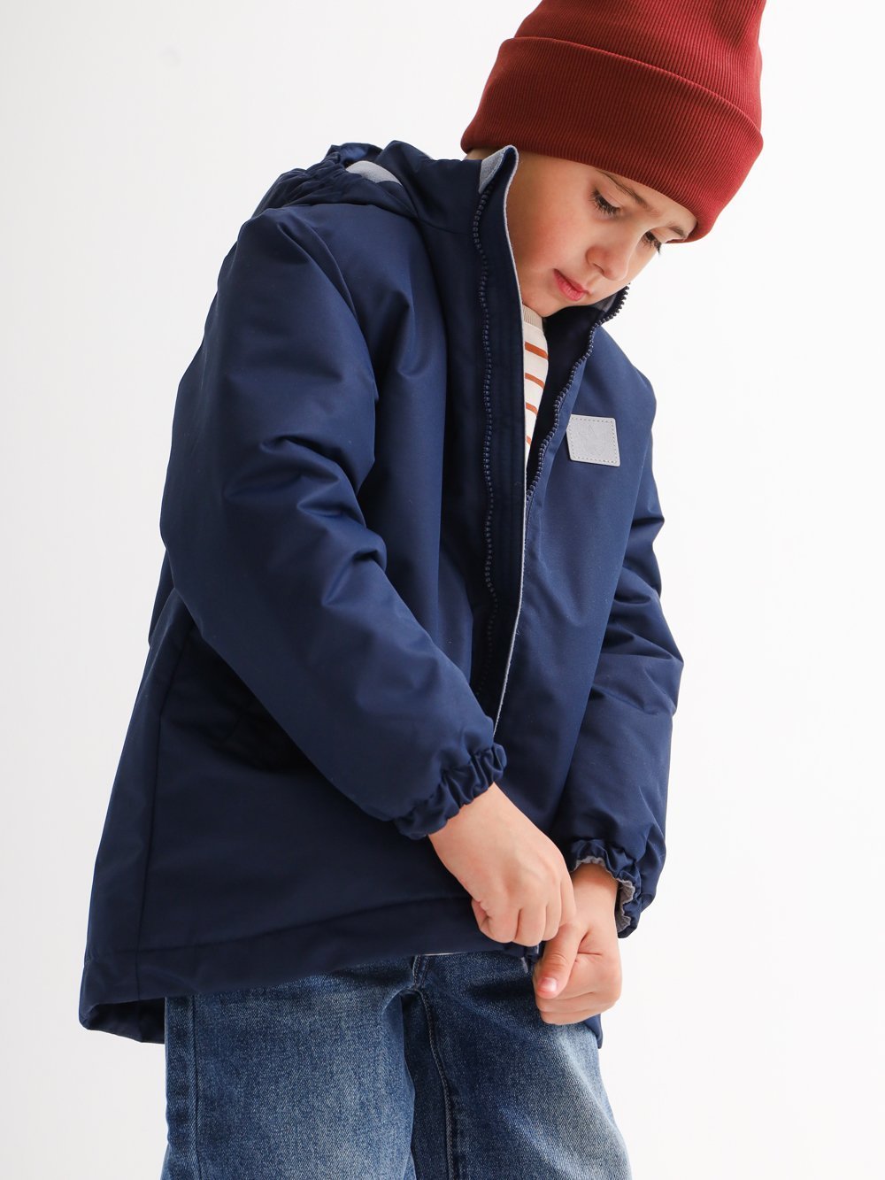 Куртка с застежкой на тракторную молнию с внутренним ветрозащитным клапаном и втачным капюшоном с воротником-стойкой. Два прорезных кармана спереди, утяжка по низу изделия, манжеты на резинке на рукавах.