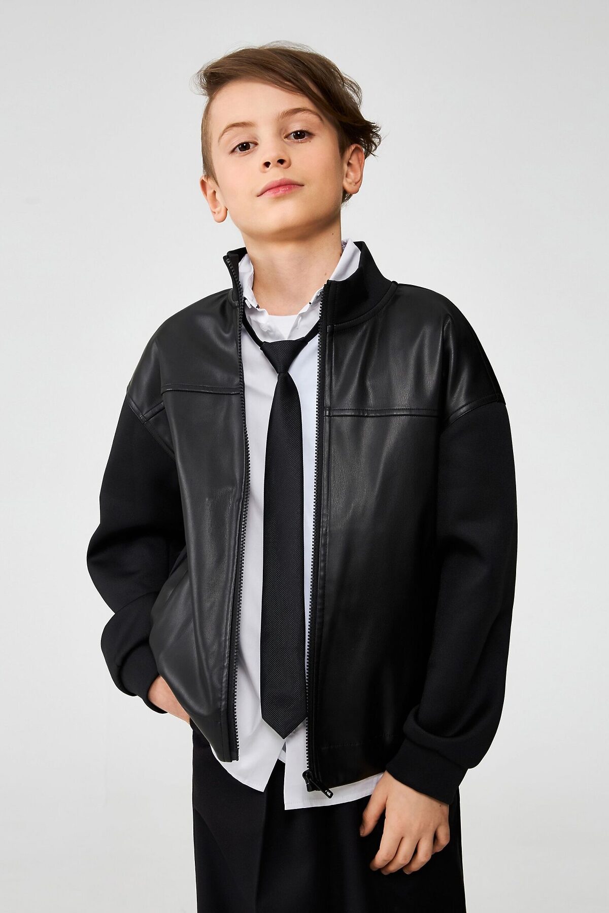 Куртка детская для мальчиков Eraser черный. Куртка для мальчика изготовлена из ткани трикотажного полотна и ткани с ПУ покрытием (искусственная кожа). Облегчённая модель без подкладки подойдет для прохладных летних дней, а также для ношения в тёплый демисезон. Куртка с центральной застёжкой на молнию. По низу длинных трикотажных рукавов расположены манжеты для лучшего прилегания к телу и сохранения тепла. Короткий воротник-стойка закрывает горло. Спереди расположены два наклонных кармана в листочку, которые делают куртку удобной для повседневного использования.