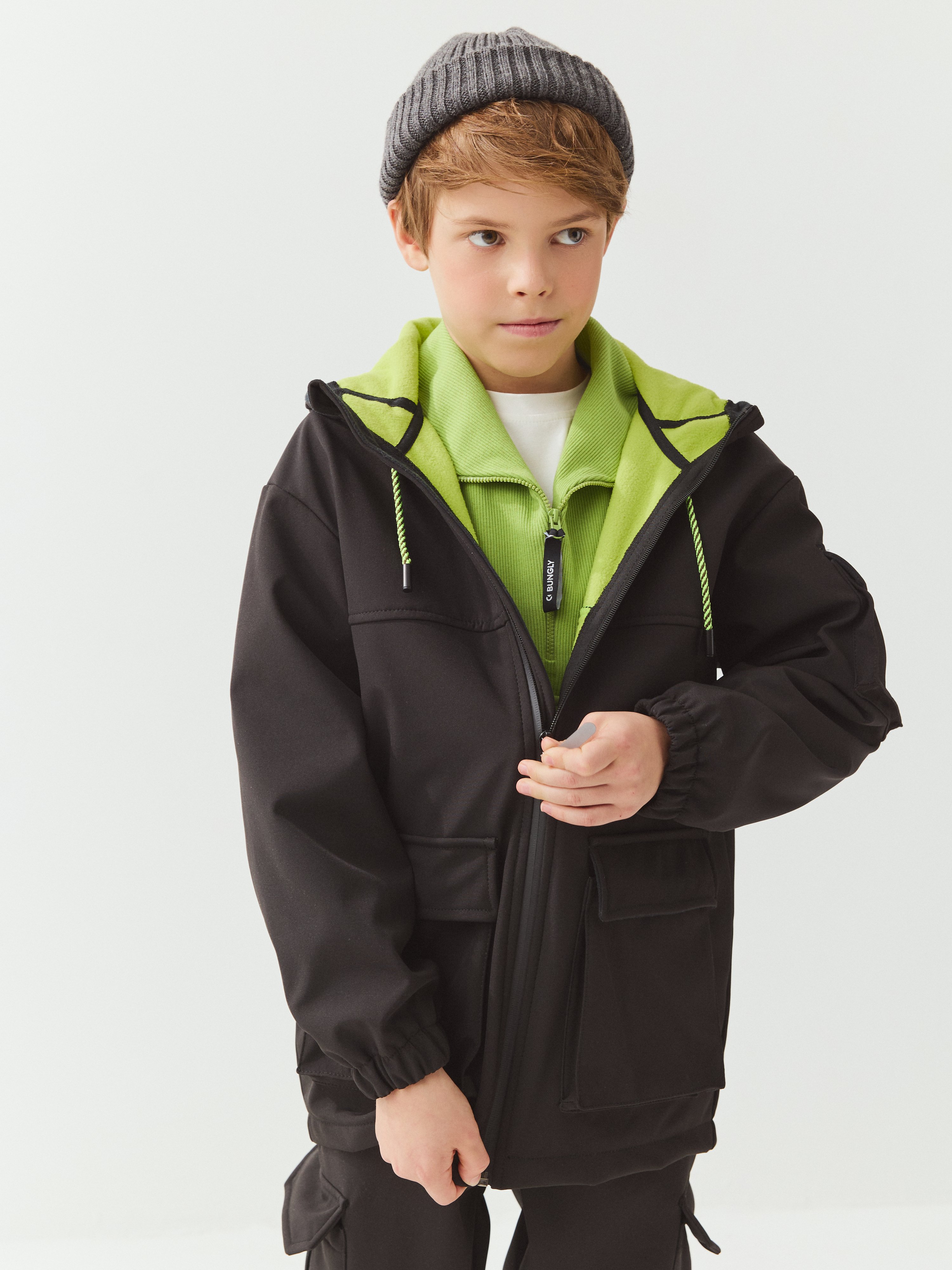 Мембранная ткань софтшелл с показателями 10000/10000 обеспечивает надежную защиту от влаги и продувания, позволяя детям активно проводить время на улице.