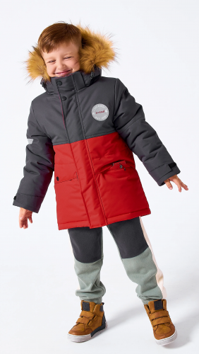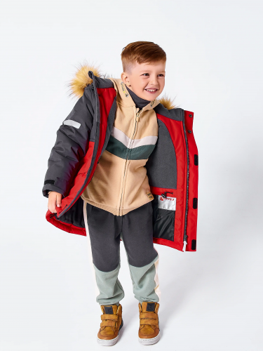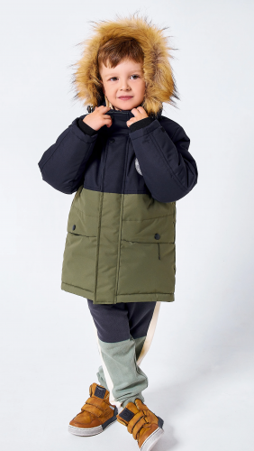 Куртка зимняя для мальчиков комбинированная прямого силуэта. Центральная молния закрыта планкой на кнопках и липучках. Подкладка комбинированная из флиса и шелка. Капюшон с отстёгивающейся опушкой из искусственного меха. 2 нижних кармана с клапанами на кнопках. На куртке расположены светоотражающие элементы. Модель рассчитана на температуру от -10 до -25. 100% полиэстер