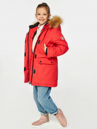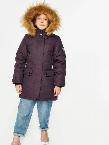 Зимнее пальто прямого силуэта для девочки. Застёжка на молнию закрыта планкой на кнопках и липучках. Подкладка комбинированная из флиса и шелка. Отстёгивающийся капюшон с подкладкой из флиса. К капюшону на молнию и кнопки пристегивается опушка из искусственного меха (енот). 4 передних кармана различной конфигурации.