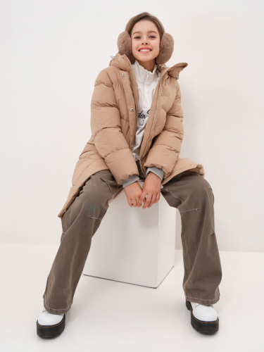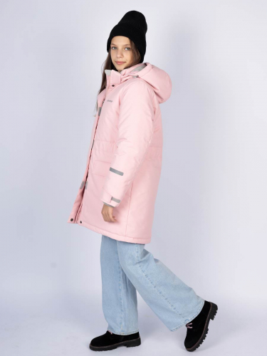 Зимняя удлиненная куртка для девочки. Прямого силуэта, чуть расклешенная к низу, с воротником и пристегивающимся капюшоном. По талии в куртке - кулиса с резиной, для дополнительного прилегания. Центральная застёжка на молнию, закрытую центральной планкой на кнопках и липучках. Прорезные карманы с магнитными кнопками. Подкладка комбинированная с флисом. На подкладке накладной карман с липучкой. На куртке расположены светоотражающие элементы. Куртка рассчитана на температурный режим от -10 до -25. 100% полиэстер