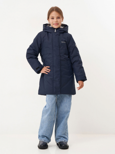 Зимнее пальто для девушки. Прямого силуэта, с втачным капюшоном. Центральная застёжка на молнию, закрыта центральной планкой на кнопках и липучках. Подкладка с флисом. Втачной капюшон с подкладкой из флиса, с резиновым шнуром и фиксаторами по лицевому краю. 2 накладных кармана с клапанами на магнитных кнопках. На левой подкладочной полочке – накладной карман с липучкой. На куртке использованы светоотражающие элементы. Модель рассчитана на температуру от -5 до -20. 100% полиэстер