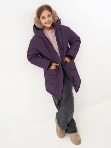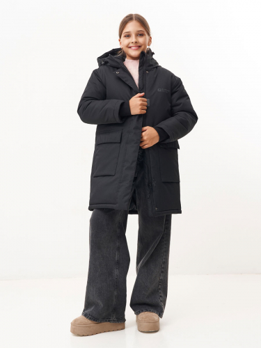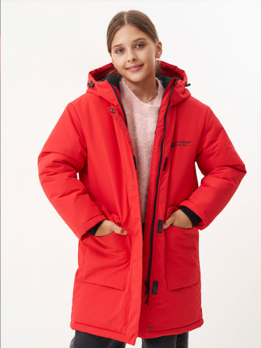 Зимнее пальто для девушки. Прямого силуэта, с втачным капюшоном. Центральная застёжка на молнию, закрыта центральной планкой на кнопках и липучках. Подкладка с флисом. Втачной капюшон с подкладкой из флиса, с резиновым шнуром и фиксаторами по лицевому краю. 2 накладных кармана с клапанами на магнитных кнопках. На левой подкладочной полочке – накладной карман с липучкой. На куртке использованы светоотражающие элементы. Модель рассчитана на температуру от -5 до -20. 100% полиэстер