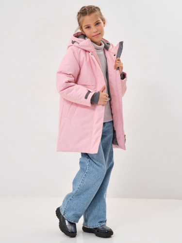 Зимняя удлиненная куртка для девочки. Прямого силуэта, чуть расклешенная книзу, с втачным капюшоном Центральная застёжка на молнию, закрытую центральной планкой на потайной кнопке и липучках. В бегунке центральной молнии светоотражающая подвеска. По талии в подкладке - кулиса с резиновым шнуром, для дополнительного прилегания. На полочках карманы с листочками на магнитных кнопках. По низу рукава паты на липучках. Внутренний манжет из трикотажа. Подкладка и внутренний капюшон с флисом. На подкладке – накладной карман с липучкой. На куртке располагаются светоотражающие элементы. Куртка рассчитана на температурный режим от -10 до -25. 100% полиэстер