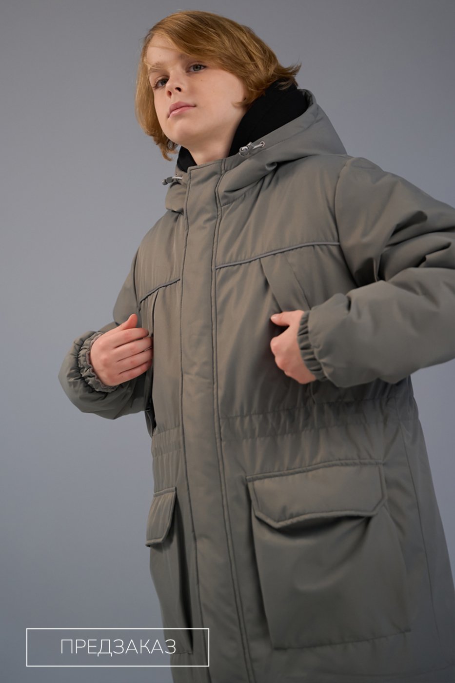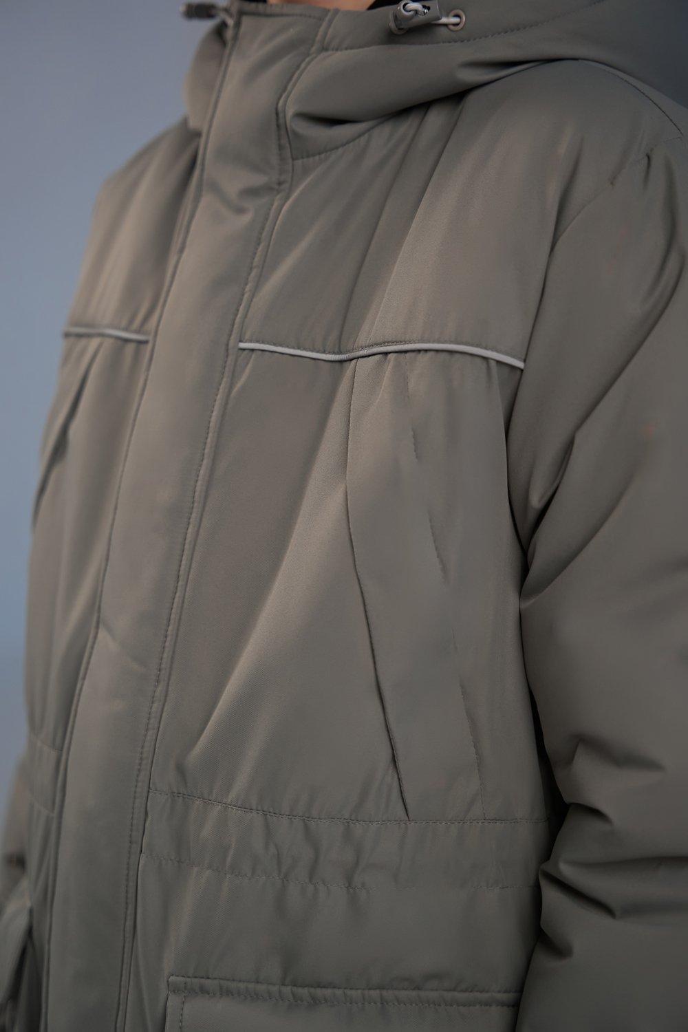 Демисезонная парка из мембранной ткани с застежкой на молнию с ветрозащитным клапаном с защитой от защемления подбородка. Два кармана-портфеля с клапаном на магнитах и  два вместительных кармана на молнии на груди. Втачной капюшон с утяжкой и подкладкой из флиса, манжеты на мягкой резинке изнутри отделаны флисом, подкладка до линии талии -из флиса, остальное - подкладочная ткань. Внутренняя кулиса на талии для лучшей ветрозащиты. Световозвращающий кант для защиты в темное время суток.