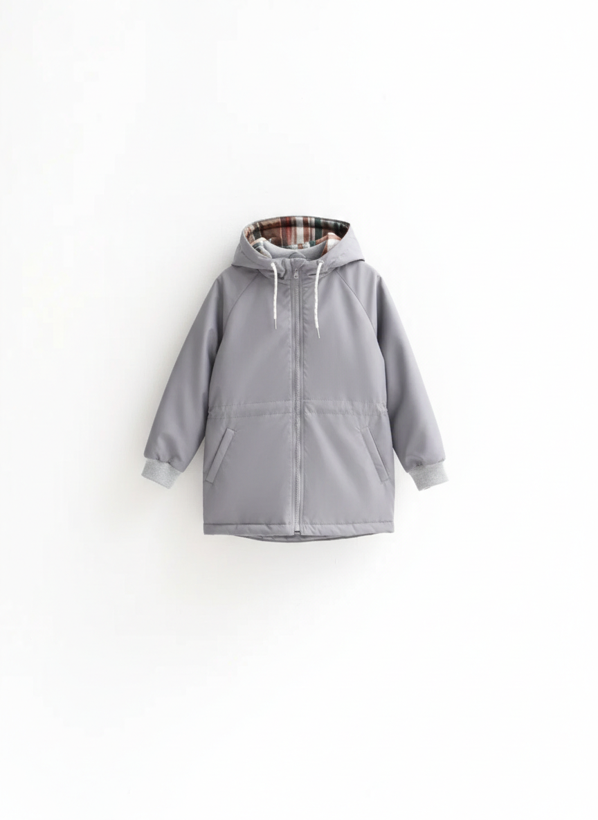 Парка с застежкой на молнию с внутренним ветрозащитным клапаном с защитой от защемления подбородка. Втачной капюшон с утяжкой на шнур и трикотажным воротничком. Внутренняя утяжка по талии для защиты от поддувания и смены силуэта. Рукава-реглан с трикотажными манжетами. Контрастная фланелевая подкладка и световозвращающие элементы для безопасности ребенка в темное время суток.