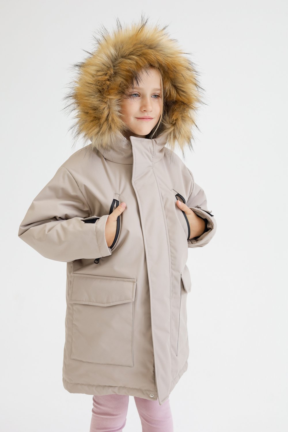 - съемная опушка капюшона из искусственного длинноворсового меха на кнопках, при отстегивании места крепления прикрываются планкой-гаражом