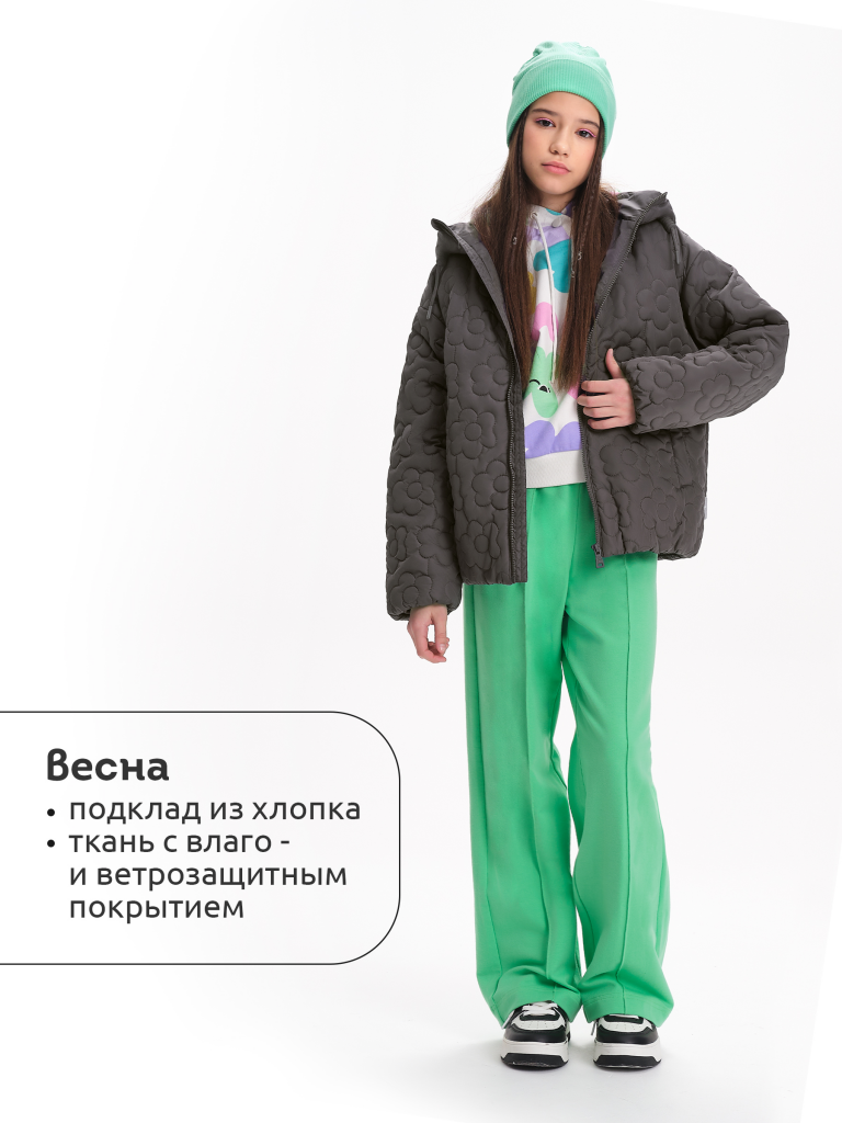 Укороченная куртка для девочки: стиль, комфорт и безопасность в каждой детали! Куртка демисезонная для девочки — идеальный выбор для весенних и осенних прогулок. Она станет настоящим хитом сезона, сочетающим в себе стильный дизайн и множество продуманных функций, которые порадуют как вас, так и вашу дочку! Куртка весенняя на тонком синтепоне, что делает ее легкой и теплой одновременно. Ваша дочка будет чувствовать себя комфортно даже в прохладную погоду. Подклад из мягкого хлопкового трикотажа обеспечивает комфорт, в рукавах подклад из полиэстера облегчает надевание. Куртка с капюшоном. Двухшовный глубокий капюшон с утяжкой на шнурок отлично защищает от ветра и дождя. Прочная тракторная молния с защитой подбородка и удобным пуллером, что делает процесс застегивания максимально удобным для ребёнка. Под молнией ветрозащитная планка. Внутри рукава предусмотрен манжет из риба, который не позволит ветру задувать в рукава. Внутренняя регулировка изделия эластичным шнуром по низу обеспечивает идеальную посадку и защиту от ветра. Светоотражающие элементы в боковых швах и по центру спинки гарантируют видимость в темное время суток. По переду глубокие прорезные карманы с листачкой добавляют не только стильный акцент, но и обеспечивают место для хранения мелочей. Внутренний карман подходит для хранения важных вещей. Это позволит вашей дочке быть организованной и всегда иметь под рукой всё необходимое. Укороченная куртка весенняя для девочки — отличный выбор, который прекрасно подойдет как для малышек, там и для девочек подростков. Стильный дизайн, комфорт и множество практичных деталей сделают каждую прогулку веселой и безопасной. Не упустите возможность порадовать свою маленькую модницу! Рекомендуемый температурный режим не ниже 0°C. Не забывайте о выборе правильного размера. Используйте таблицу размеров на фотографии, чтобы выбрать подходящий размер. Обратите внимание, что цвет товара на экране вашего устройства может отличаться от реального. Состав: 100%полиэстер, подклад: 60%хлопок 40%полиэстер, подклад рукавов: 100%полиэстер, утеплитель: 100%полиэстер Возрастная группа: Junior Сезон: Весна Год: 2025 Пол: Девочки