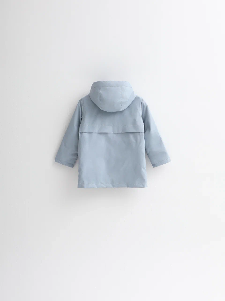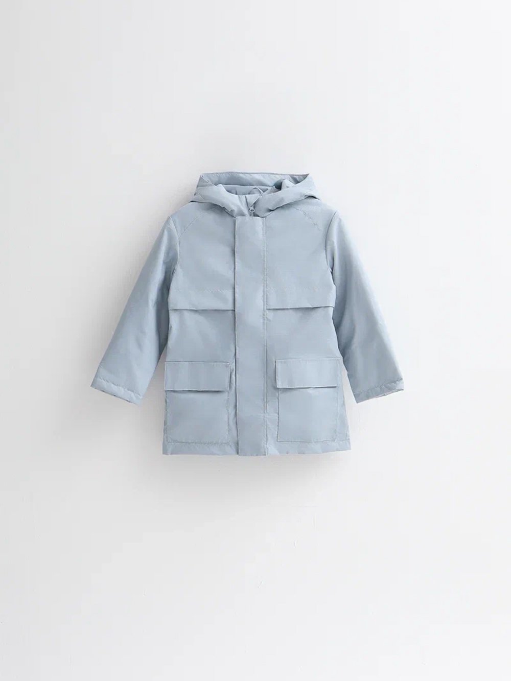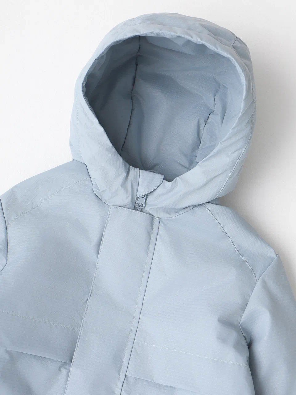 Плащ утепленный прямого силуэта, умеренного объема, длина выше линии колен. Глубокий капюшон, застежка на молнию с планкой на магнитных кнопках. Два накладных кармана с клапаном на магнитах, имитация отлетной кокетки.