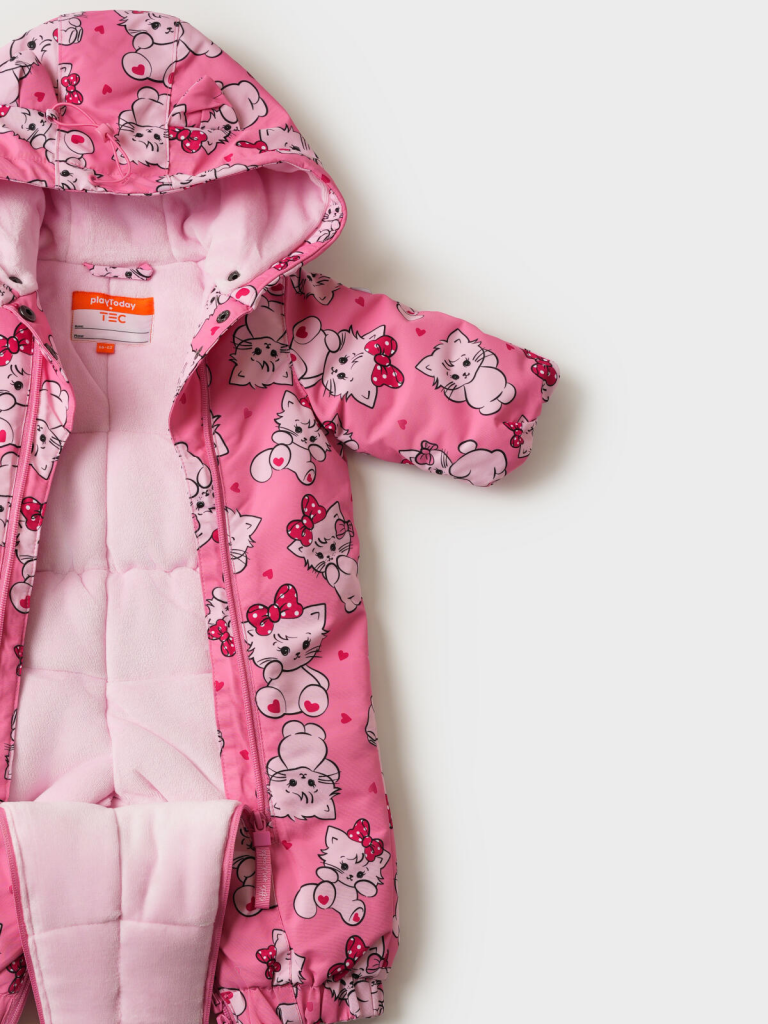 Детский демисезонный мембранный комбинезон для новорожденной девочки от PlayToday — надежная защита в прохладное время года с температурным режимом от 15 до 5 °C. Эта модель создана для активных малышей, которым нужна свобода движений и максимальный комфорт на прогулках и в зимних играх.Преимущества модели:+ температурный режим от 15 до 5 °C — комфорт и тепло+ мембрана 5000*5000 — обеспечивает надежную защиту от ветра и влаги, при этом позволяет коже дышать+ мягкая велюровая подкладка с высоким содержание хлопка — создают дополнительное тепло и комфорт+ несъемный капюшон с утяжкой на стопперах — регулируется по объему и надежно защищает от ветра и снега+ несъемные рукавички+ рукава на резинке — предотвращают проникновение холода и снега+ светоотражающие элементыКомбинезон выполнен из прочного материала с мембраной, что делает его водо- и ветронепроницаемым. Трикотажная подкладка внутри обеспечивают комфорт при носке и защищают от холода. Несъемный капюшон легко снимается при необходимости, а утяжки позволяют точно подогнать комбинезон по фигуре ребенка.Рукава с рукавичками надежно защищают от попадания снега.Размерный ряд: 56-74 см — идеально для малышей девочек от месяца до 2 лет.Когда носить:Комбинезон станет отличным выбором для зимних прогулок, игр на свежем воздухе, поездок в детский сад и других активностей в прохладный погоду.Советы по стилю:Носите с теплыми шапками, варежками и утепленными сапожками. Дополните образ яркими аксессуарами, чтобы выделить малыша среди зимнего пейзажа. Этот комбинезон подарит малышу тепло и защиту, а маме — уверенность в безопасности и комфорте ребенка.PlayToday — забота и комфорт для самых маленьких! Верх: 100% полиэстерМембрана 5000*5000Подкладка: велюрНаполнитель: 100% полиэстер, 250 г/м2