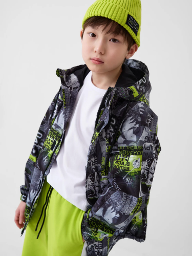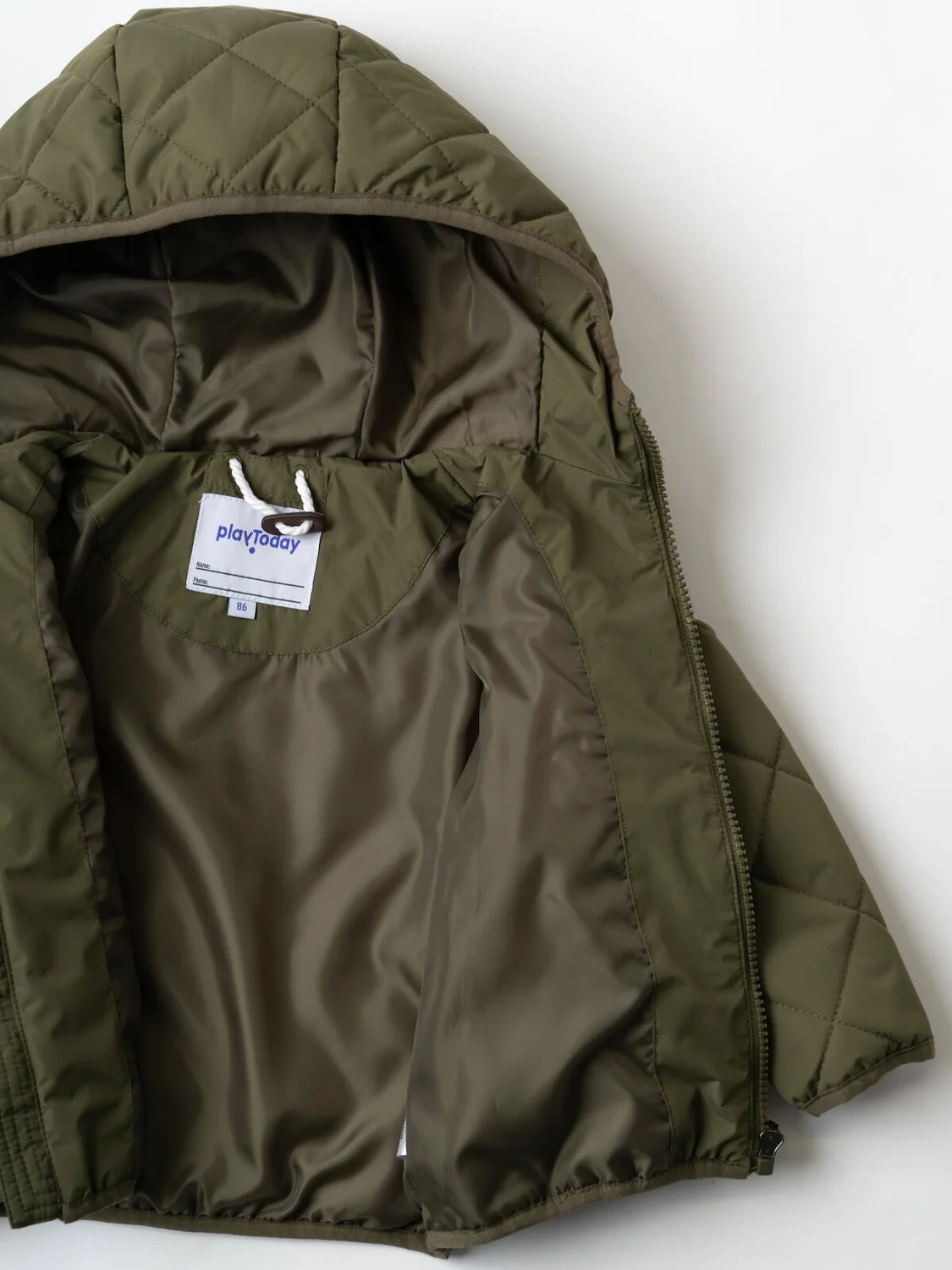 Куртка демисезонная стеганая для мальчика. Температурный режим от +15С до 0С. Ткань с ветрозащитным и водоотталкивающим покрытием. Внутри — гладкая подкладка из таффеты. Капюшон несъемный с эластичной окантовкой. Удобные боковые карманы. Внизу изделия и на манжетах — эластичная окантовка, которая помогает лучше прилегать к телу. Яркий акцент — мягкий съемный брелок в виде тигрёнка и декоративная нашивка спереди.