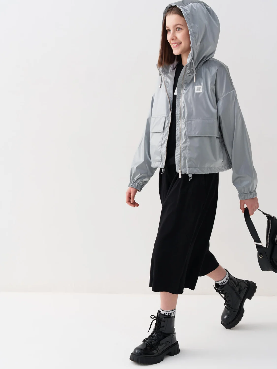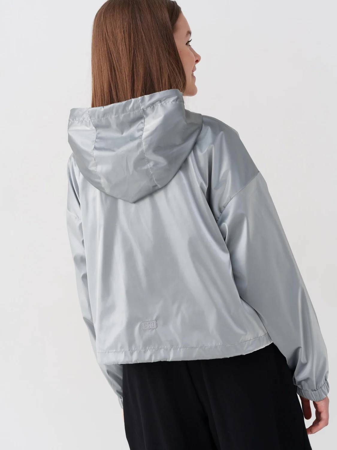 Укороченная ветровка для девочки подростка. Температурный режим от +20 до +10С. Ткань с ветрозащитным и водоотталкивающим покрытием. Внутри мягкая подкладка из трикотажа. Спереди — два больших накладных кармана на кнопках. Манжеты на резинке. По низу утяжка на шнур. На спине и рукаве — светоотражающие элементы.
