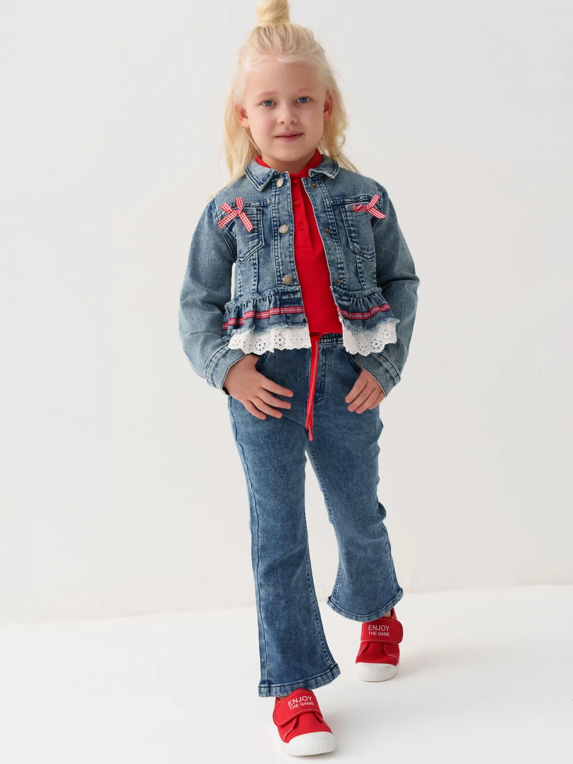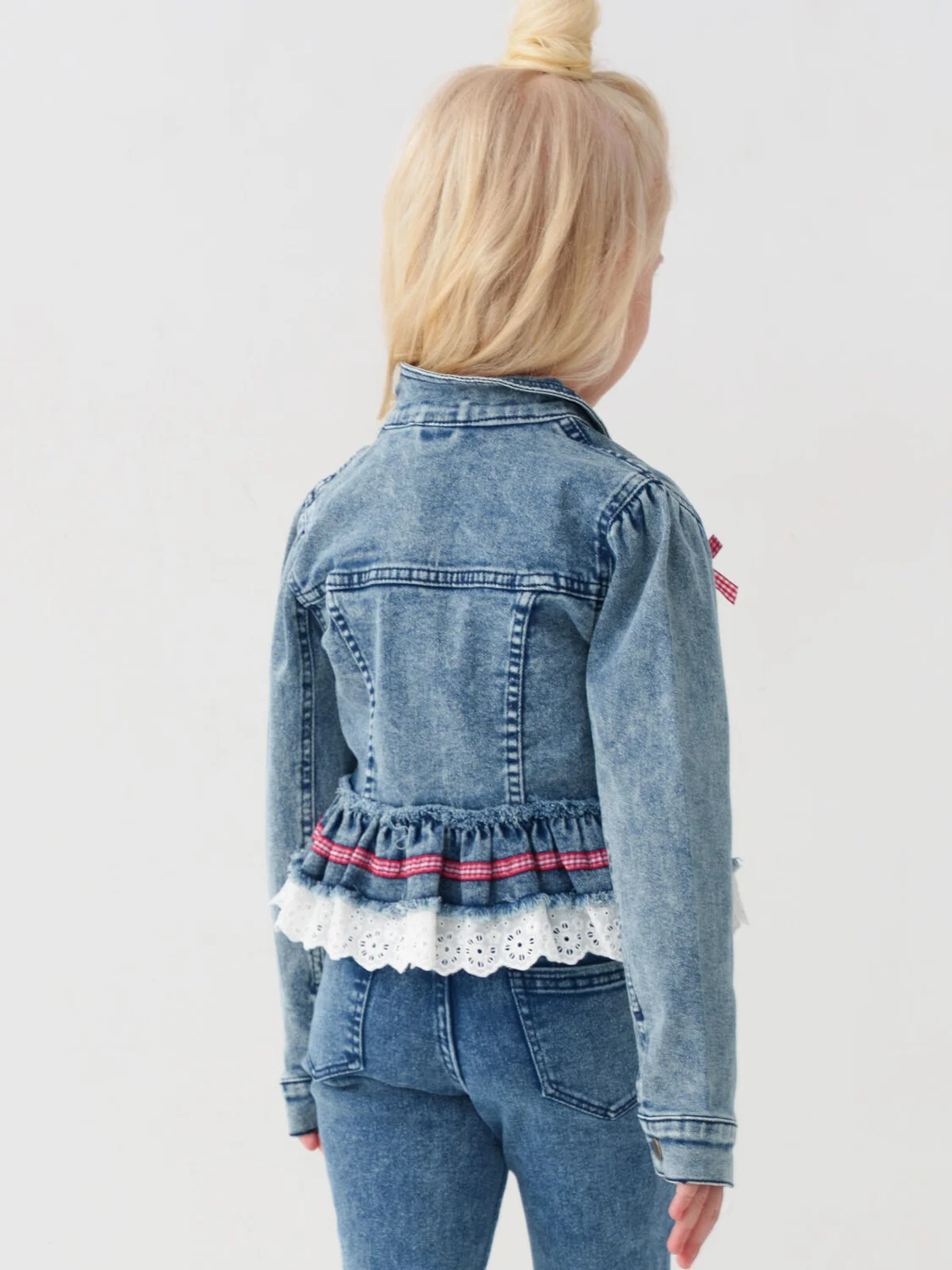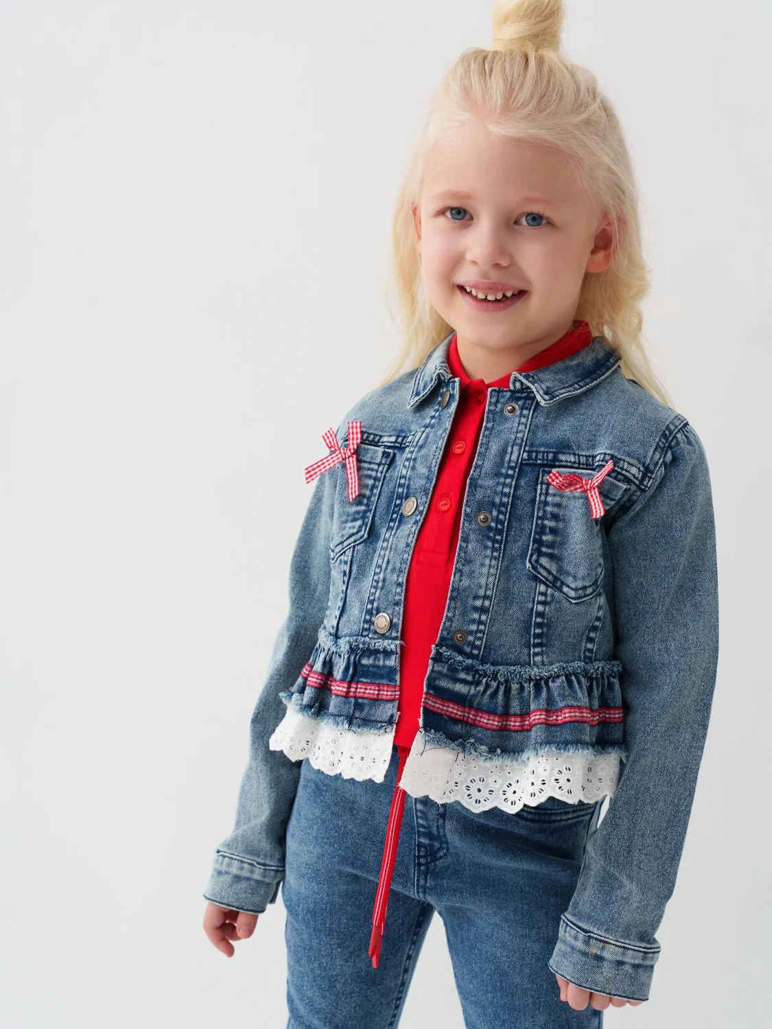 Укороченная джинсовая куртка для девочки. Внизу куртки пришита двойная оборка: из джинсовой ткани и из белого кружева с узорами. Спереди два нагрудных кармана, украшенные маленькими красно-белыми бантиками в клетку. Куртка застегивается на металлические кнопки спереди и на манжетах. Воротник классический, отложной.