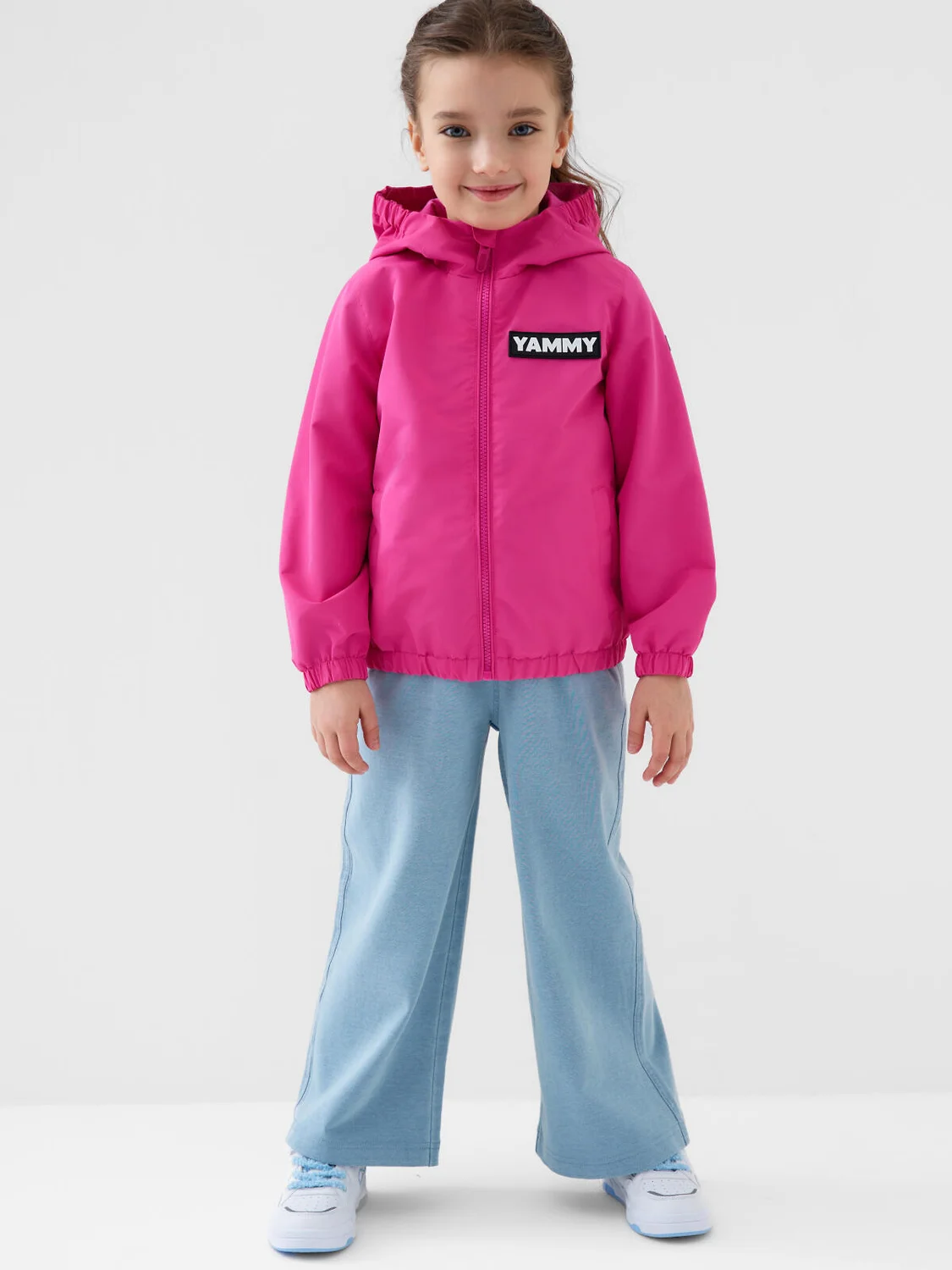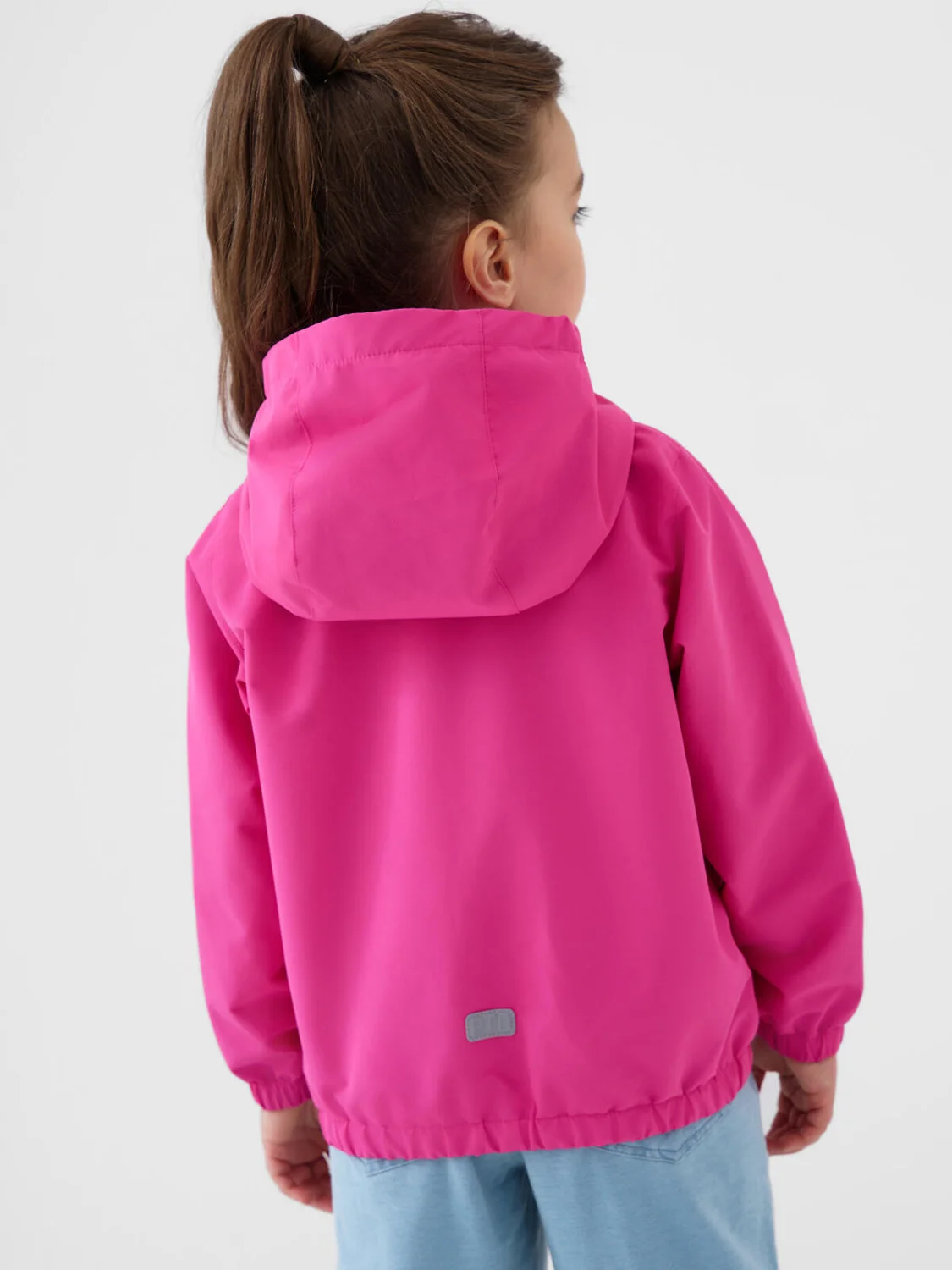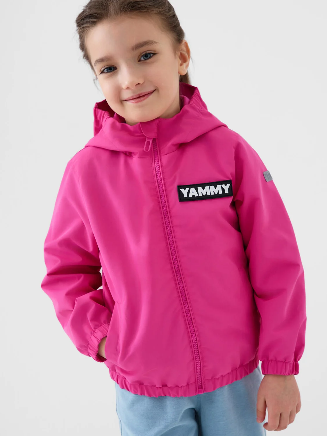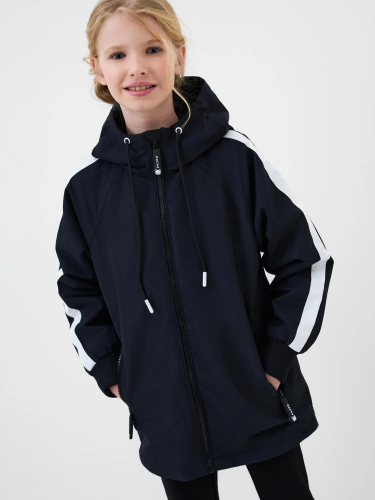 Детская ветровка для девочки. Температурный режим от +20С до +10С. Ткань с мембранным покрытием 5000х5000. Внутри трикотажная подкладка. Капюшон несъемный, на резинке. Удобные боковые карманы на липучке. Внутренний карман на липучке. Рукава и низ изделия собраны на эластичную резинку, чтобы защищать от ветра. На рукаве и на спинке светоотражающие нашивки — для безопасности в темное время суток.
