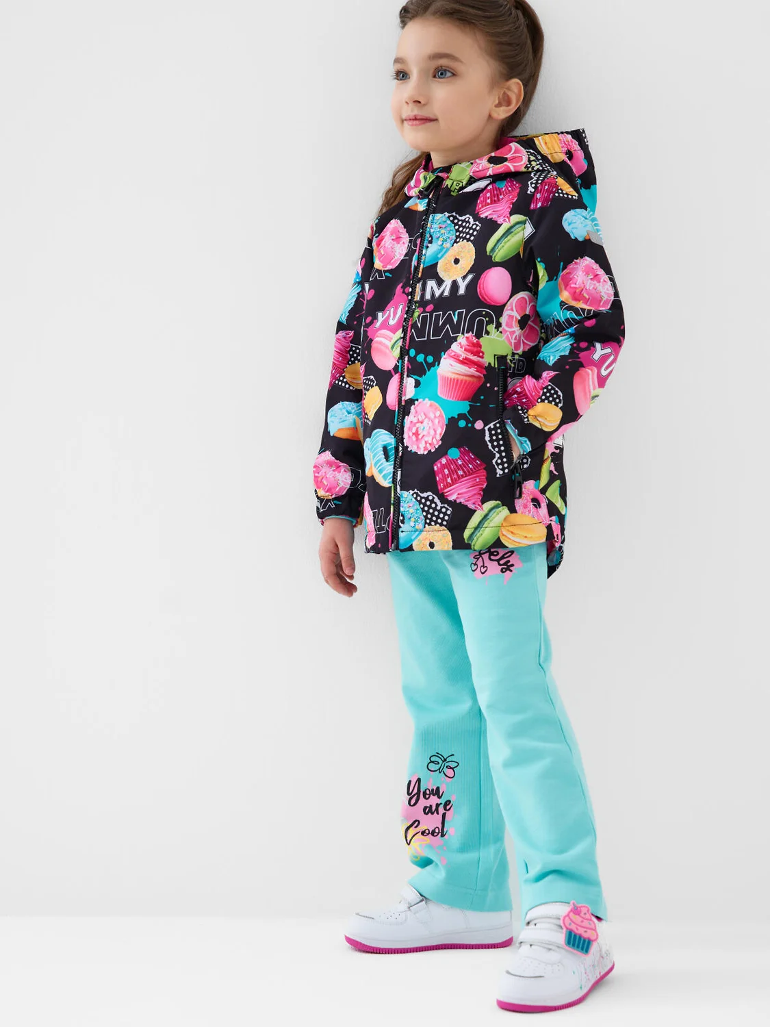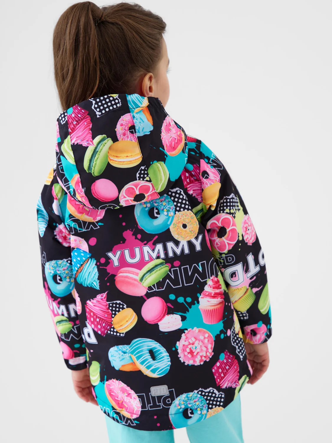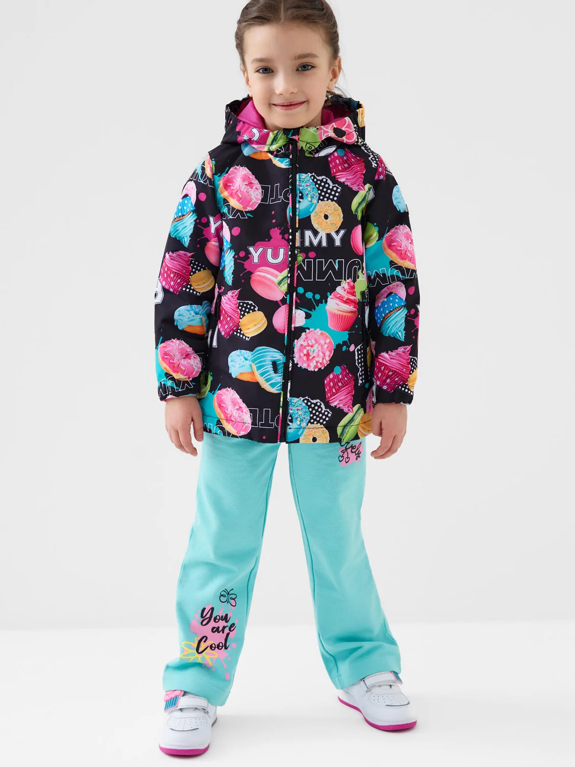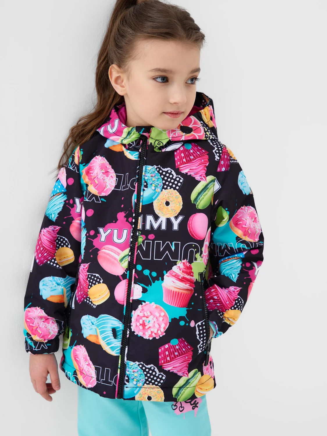 Ветровка детская для девочки. Температурный режим от +20С до +10С. Ткань с мембранным покрытием 5000х5000. Внутри флисовая подкладка. Яркий и запоминающийся принт с пирожными, пончиками и макарунами делает изделие очень привлекательным. Капюшон несъемный на резинке. Боковы карманы на молнии. Внутренний карман на липучке. Рукава на резинке. По низу изделия утяжка со стопперами. Сзади и на рукаве — светоотражающие элементы для безопасности в тёмное время суток.