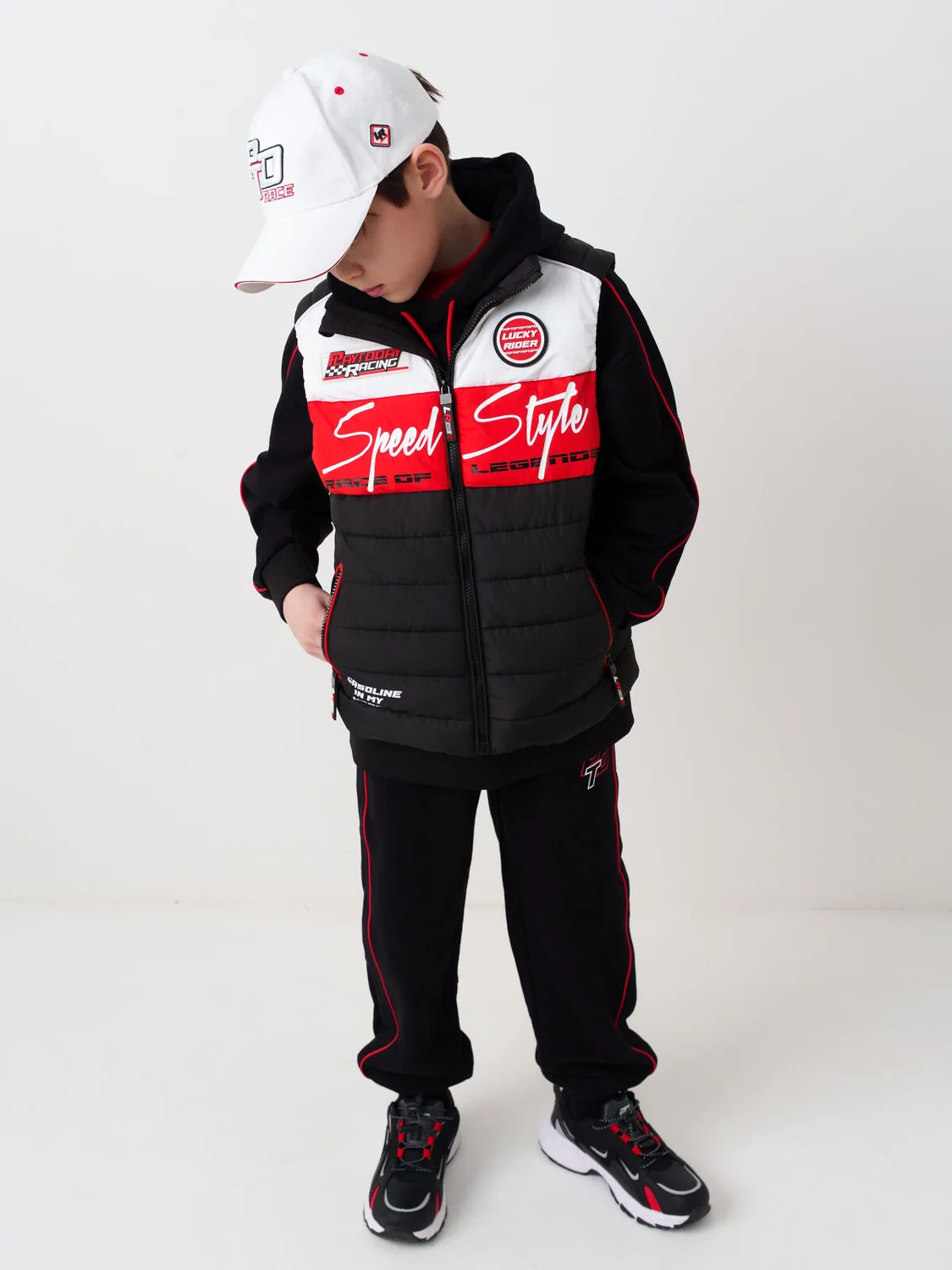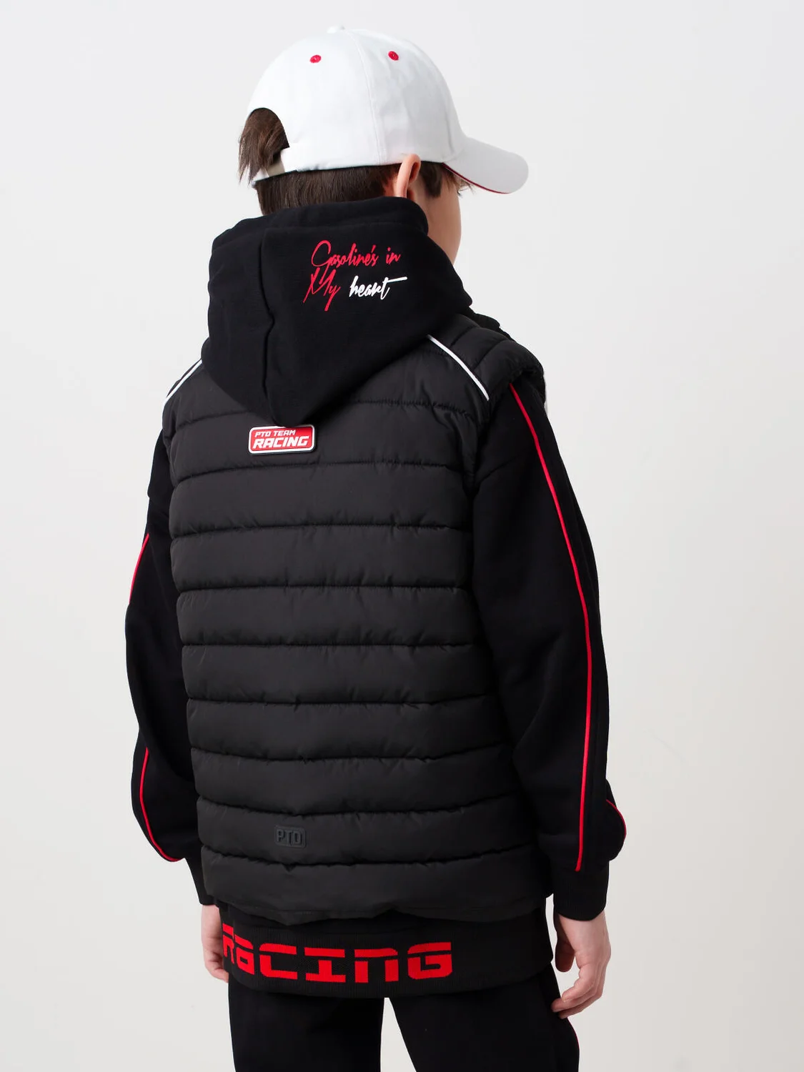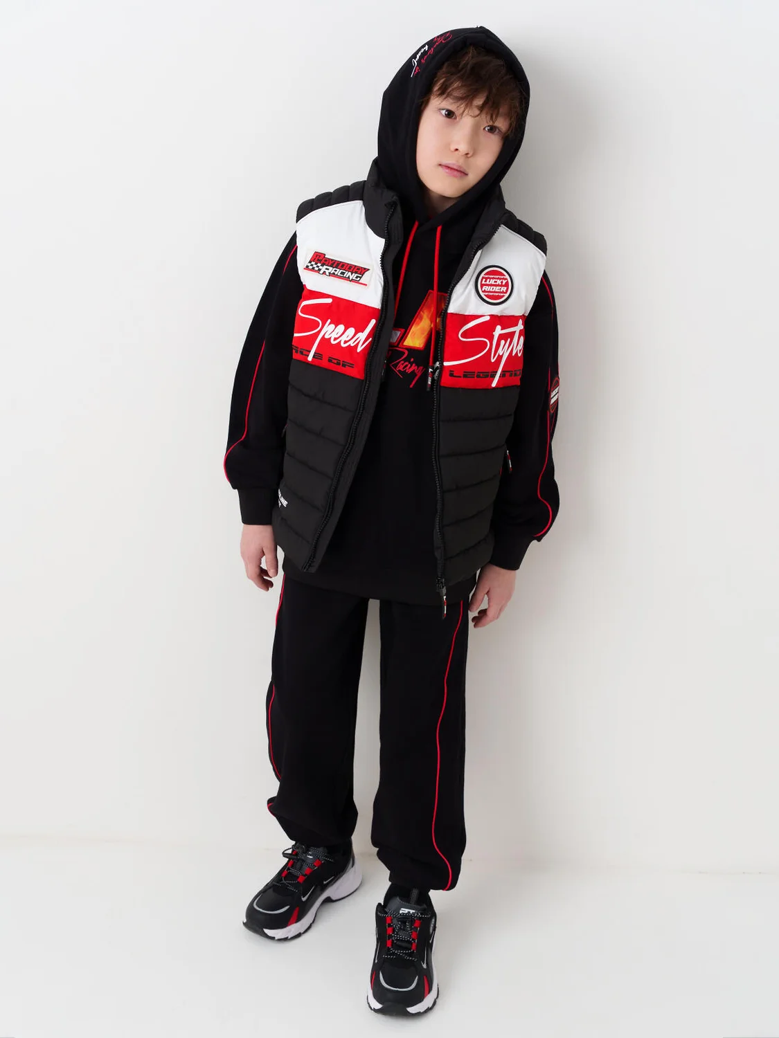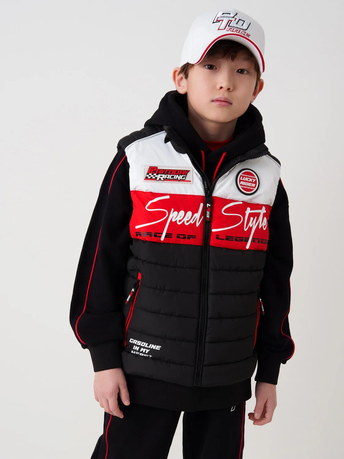 Жилет демисезонный для мальчика подростка с ярким дизайном. Температурный режим от +15С до 0С. Спереди размещены контрастные надписи и логотипы, создающие динамичный гоночный образ. Влагозащитная и ветрозащитная ткань. Внутри — подкладка из таффеты. Боковые карманы на молнии — удобно и безопасно. Воротник-стойка защищает шею от ветра. На спинке — светоотражающие элементы и резиновый ярлычок для лучшей видимости.