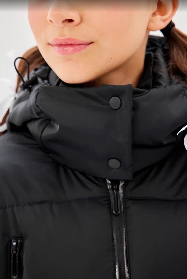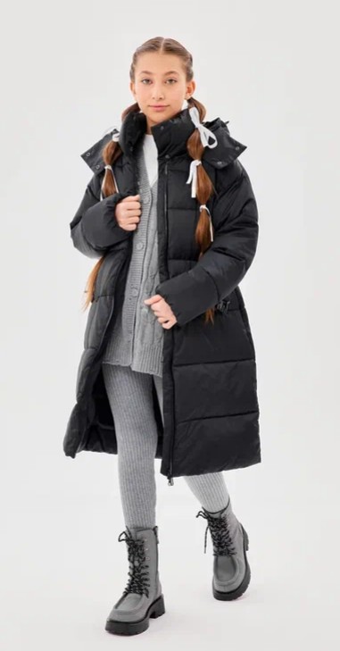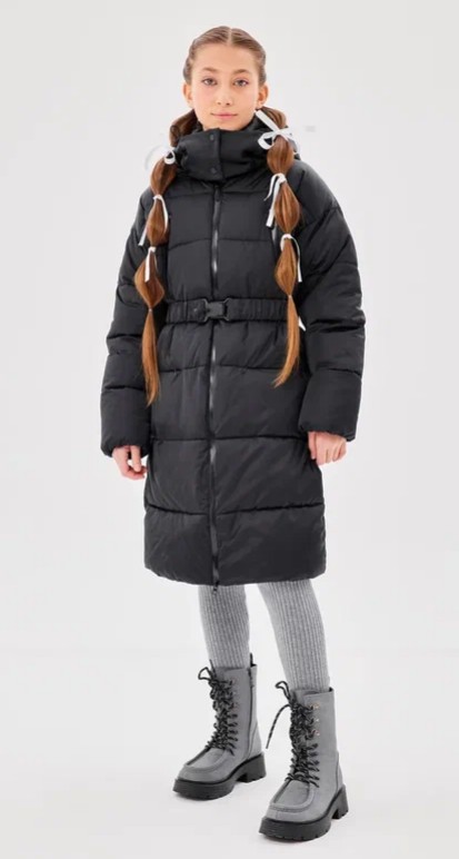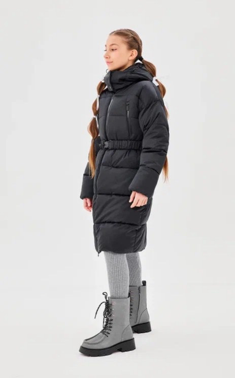 Пальто — полуприлегающего силуэта, за счет пояса по талии. Рукав втачной со спущенной линии плеча. Застежка – центральная, на декоративную молнию с ветрозащитной планкой. Воротник стойка, застегивающийся на кнопках. На переде обработаны нагрудные прорезные карманы с декоративными молниями и карманы в горизонтальных швах с потайной молнией. Пальто простегано широкими горизонтальными переборками. Капюшон — шлем втачной, несъемный с застежкой на кнопки. По краю капюшона внутренняя кулиса регулируемая шнур-резинкой и стопорами. С помощью съемного пояса возможна трансформация силуэта