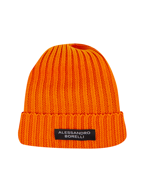 Вязаная шапка выполнена из мягкой, приятной на ощупь пряжи оранжевого цвета. Она имеет классический фасон с отворотом, на котором присутствует контрастная черно-белая нашивка с надписью ALESSANDRO BORELLI. Универсальный дизайн подчеркнет любой образ, добавив уют и тепло в холодное время года. А также обеспечит комфорт и защиту от ветра. Этот аксессуар подойдет для повседневных прогулок или зимних игр.