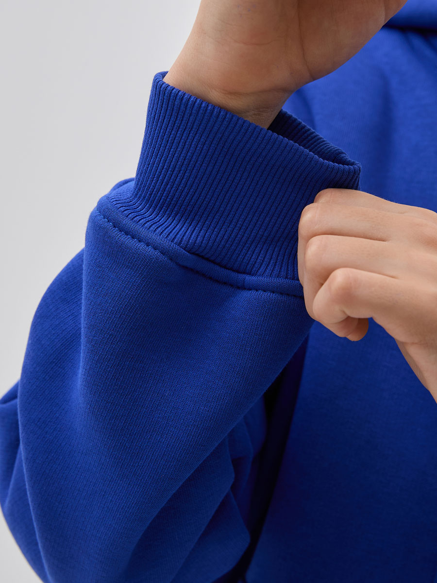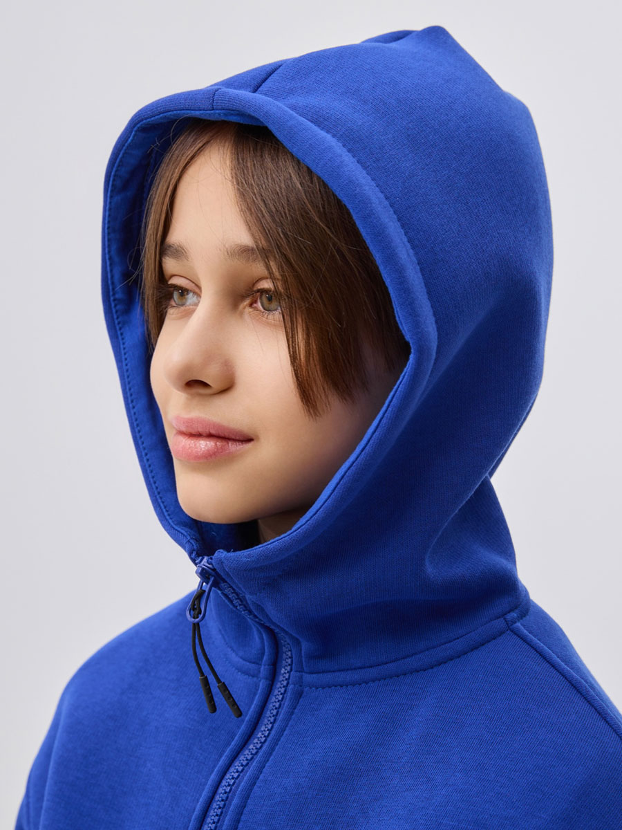 Толстовка детская из трикотажного полотна - футер с начесом, с втачным капюшоном, с центральной застежкой на молнию.  На полочке накладной карман-кенгуру. Манжеты и пояс из кашкорсе в цвет футера.
