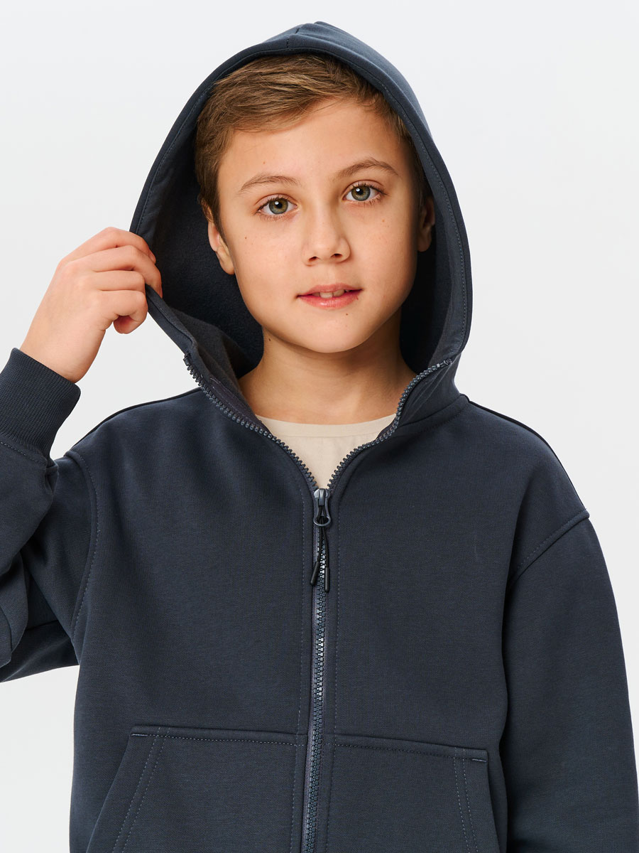 Толстовка детская из трикотажного полотна - футер с начесом, с втачным капюшоном, с центральной застежкой на молнию.  На полочке накладной карман-кенгуру. Манжеты и пояс из кашкорсе в цвет футера.