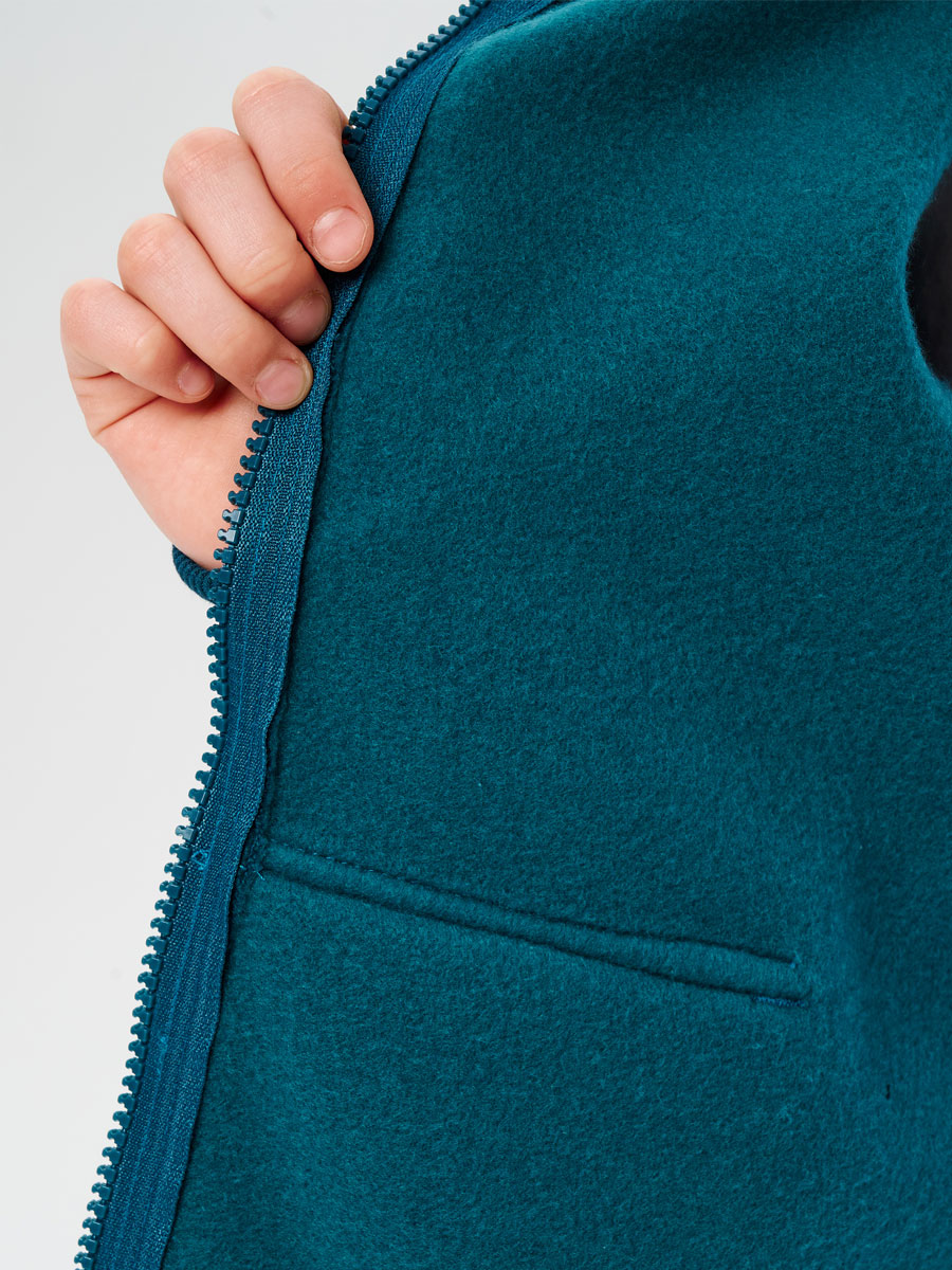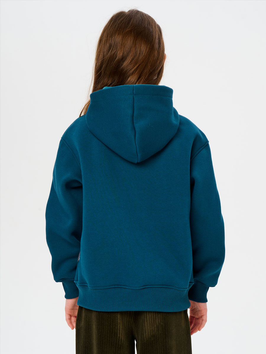 Толстовка детская из трикотажного полотна - футер с начесом, с втачным капюшоном, с центральной застежкой на молнию.  На полочке накладной карман-кенгуру. Манжеты и пояс из кашкорсе в цвет футера.