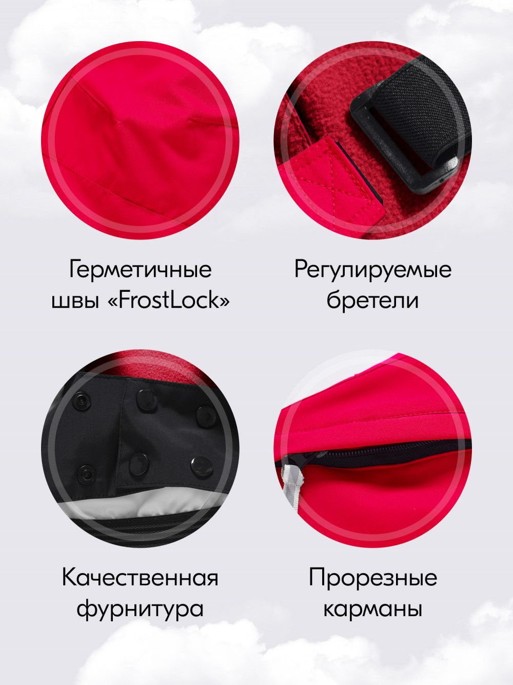 Брюки также продуманы до мелочей: съемные регулируемые бретели обеспечивают надежную посадку, а утепленная спинка гарантирует дополнительный комфорт.