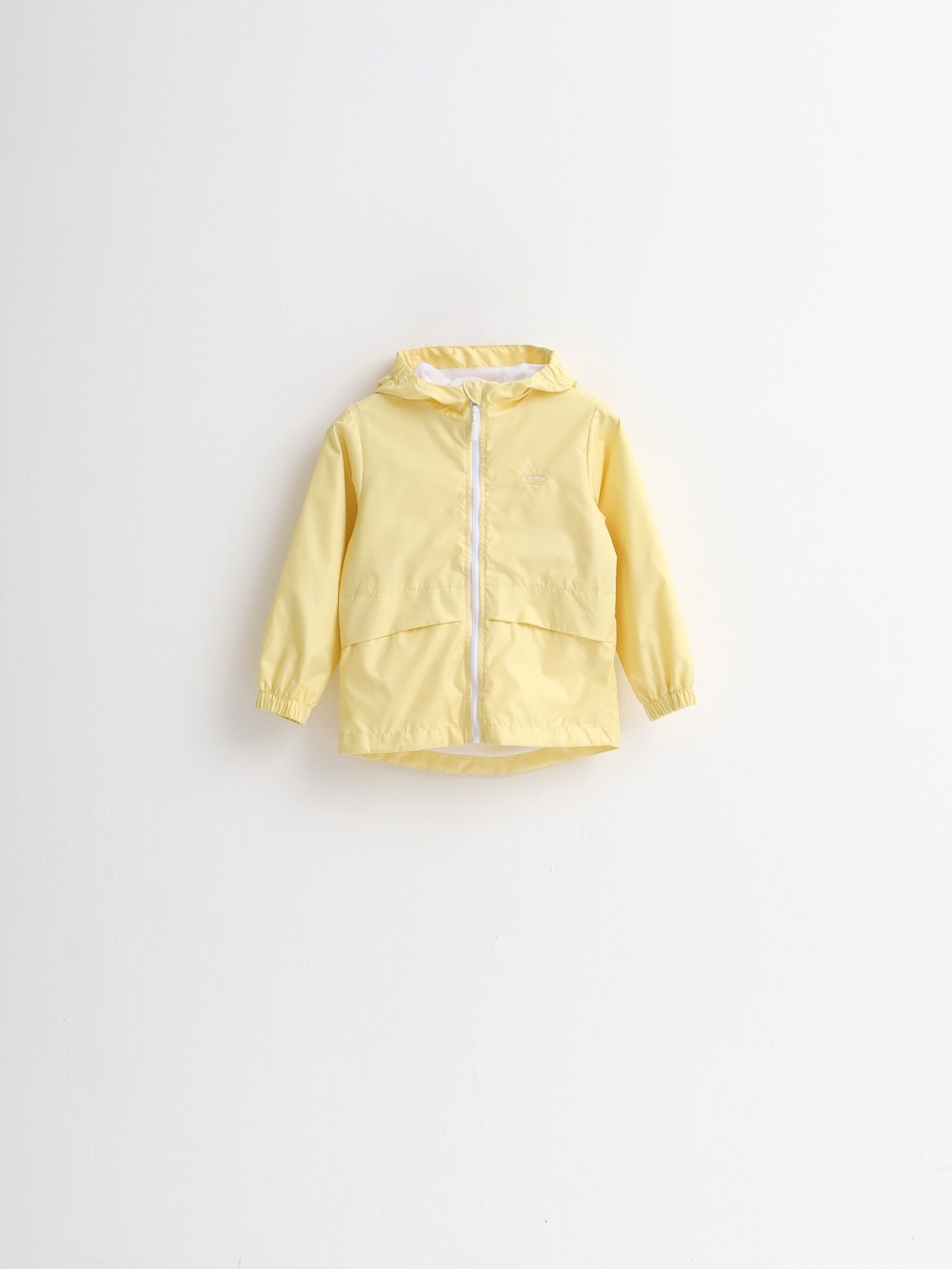Легкая ветровка свободного кроя. Капюшон с частичной утяжкой на резинку по лицевому краю. Два кармана с геометричными клапанами на полочках. Подкладка ветровки выполнена из трикотажной сетки, которая хорошо отводит влагу от тела.