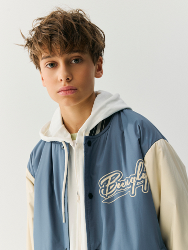 Съемный двухслойный капюшон из трикотажа с начесом, пристегивается на пуговицы.