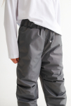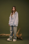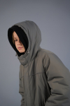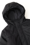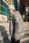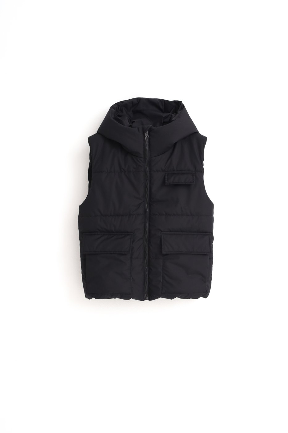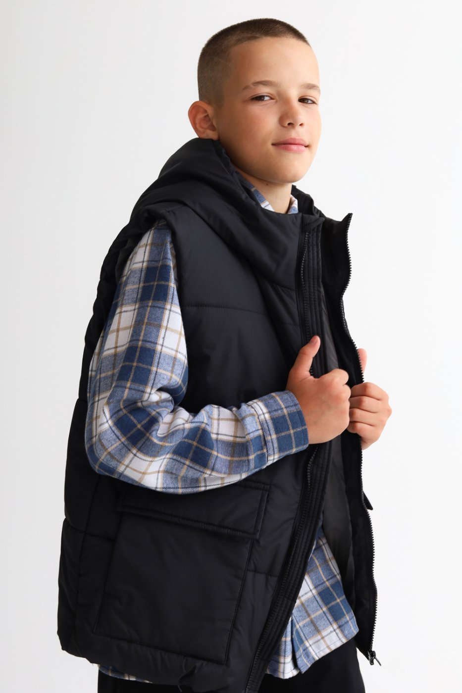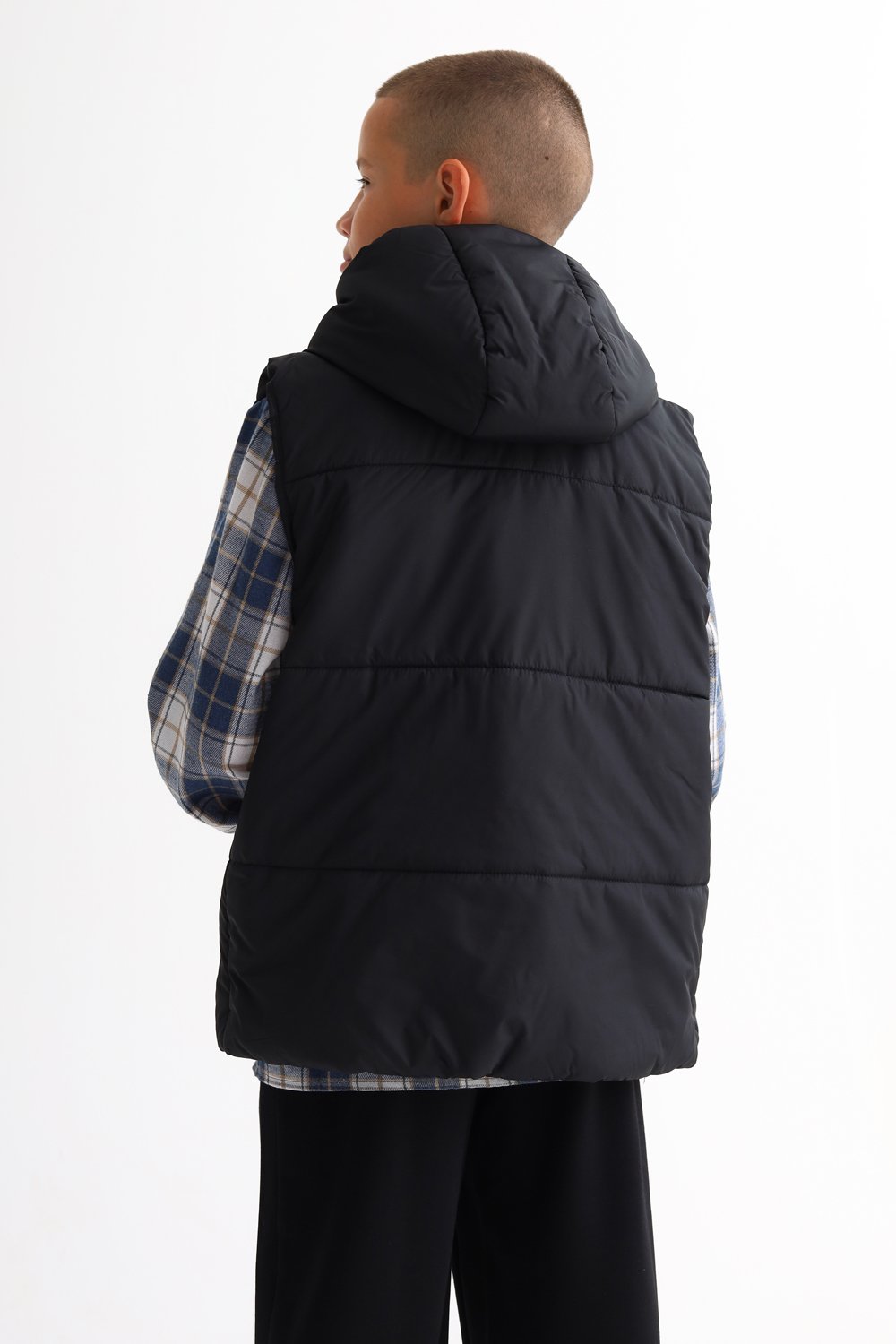 Жилет свободного силуэта с горизонтальной стежкой. Застежка на тракторную молнию с внутренним ветрозащитным пластроном. Спереди два накладных кармана (вход сбоку и сверху) с клапаном на магнитной кнопке. Имитация кармана на груди. Капюшон втачной с цельнокроеной стойкой.