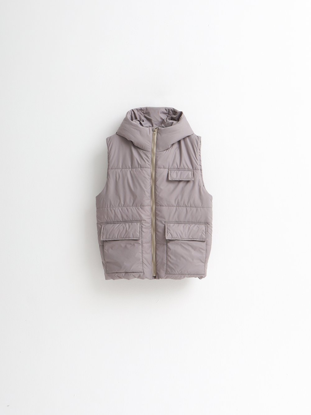 Жилет свободного силуэта с горизонтальной стежкой. Застежка на тракторную молнию с внутренним ветрозащитным пластроном. Спереди два накладных кармана (вход сбоку и сверху) с клапаном на магнитной кнопке. Имитация кармана на груди. Капюшон втачной с цельнокроеной стойкой.