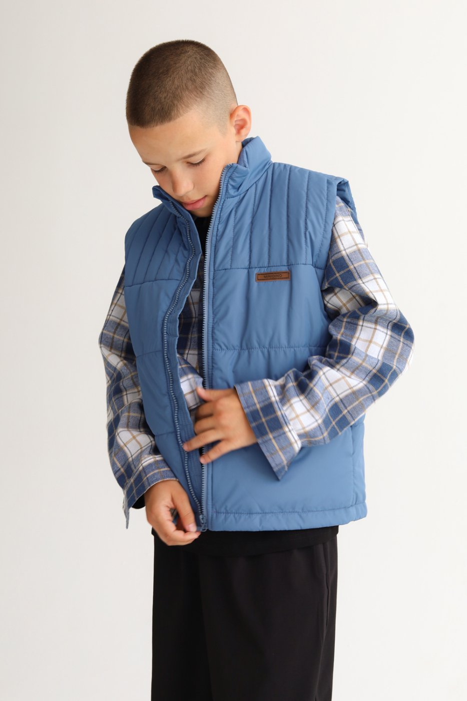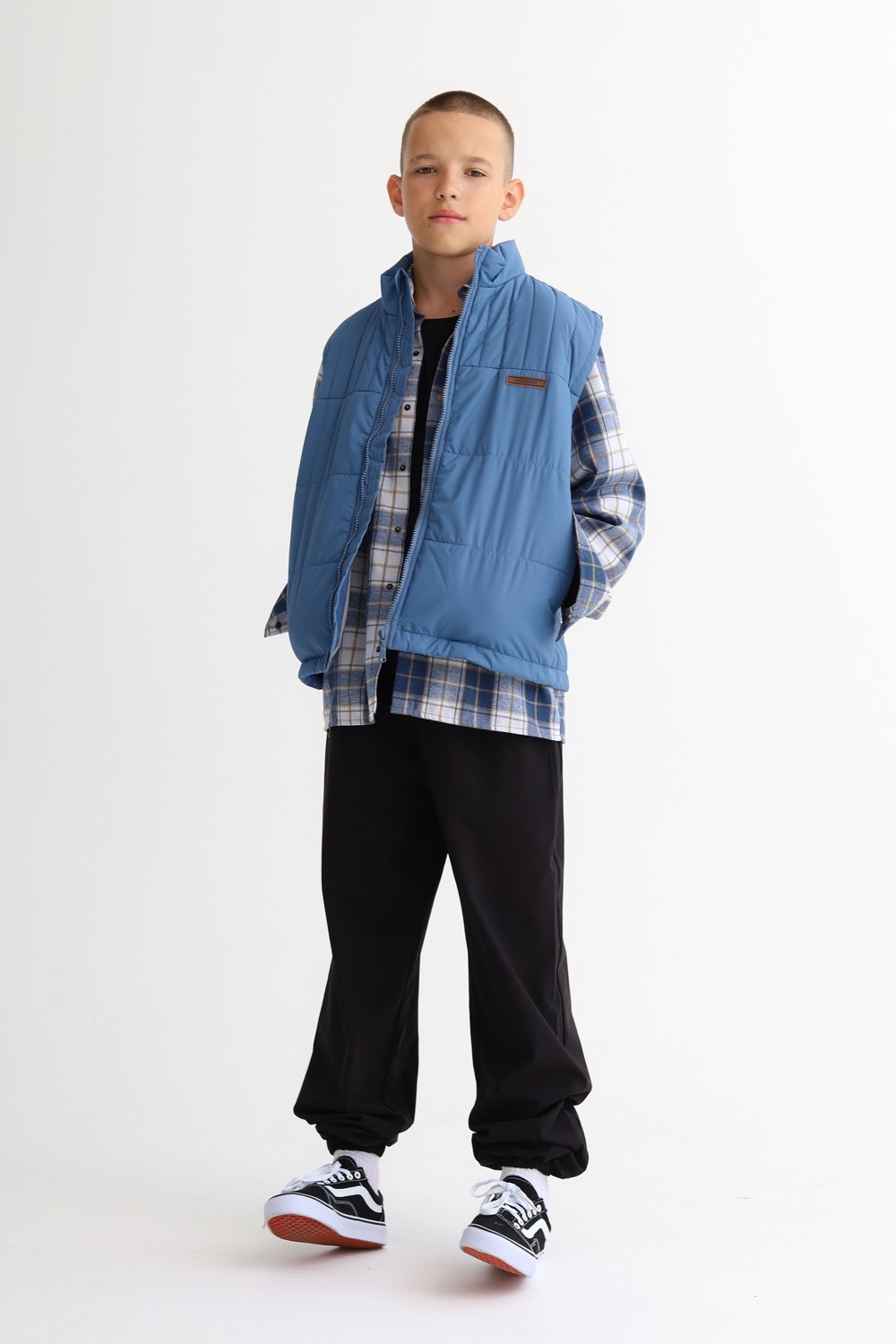 Жилет over size c центральной застежкой на тракторную молнию. Объемный воротник стойка. Отрезная кокетка с декоративной стежкой по переду и спинке. Карманы в боковых швах.