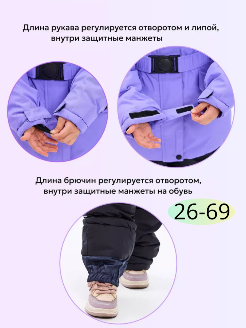Брюки на лямках очень удобные и не сковывают движения. По талии ширина пояса брюк регулируется утяжкой, а по низу брюк есть молния и липучка для регулировки объёма. Снегозащитная юбка на куртке и защитные манжеты на штанах обеспечивают дополнительную защиту от попадания снега внутрь костюма.