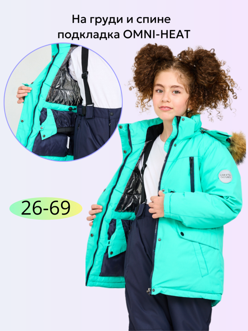 Подкладка OMNI-HEAT на груди и спинке возвращает тепло, создавая комфортные условия для ребёнка. Удобный съёмный регулируемый капюшон обеспечивает защиту от снега и ветра, а меховая съёмная опушка на капюшоне сохраняет тепло и защищает лицо от мороза.