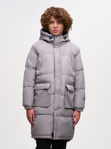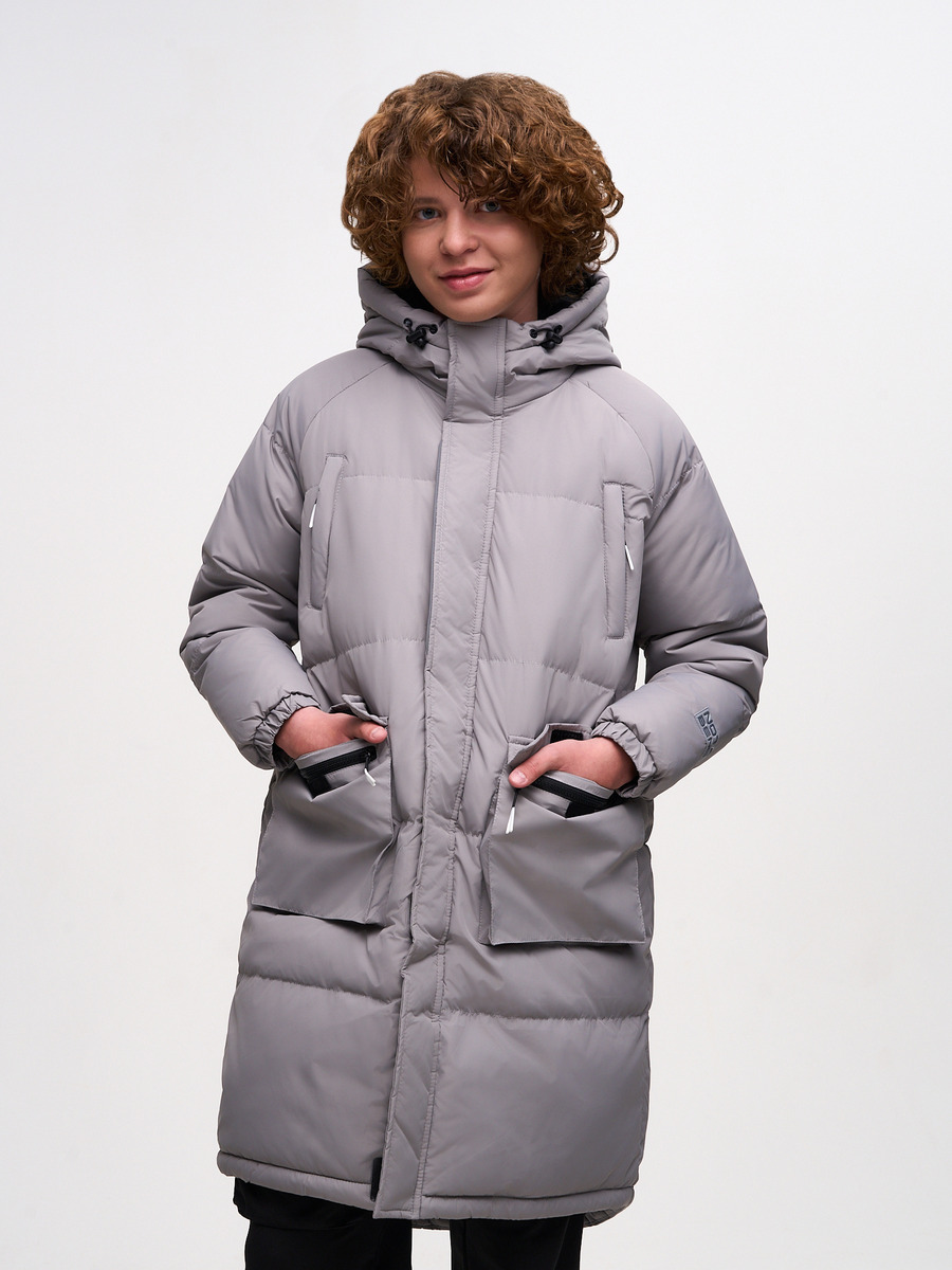 Утепленное зимнее стеганое пальто прямого свободного силуэта с втачным рукавом. Рукава с контрастным светоотражающим кантом. Верхняя часть подклада изделия выполнена из флиса и обеспечивает надежную защиту от холода. Втачной капюшон с высокой горловиной и подкладкой на флисе надежно защищает от ветра и снега. Край капюшона с кулисой, регулируемой шнуром-резинкой и стопорами. По низу рукава эластичный трикотажный манжет с прорезью для большого пальца обеспечивает сохранение тепла. На левом рукаве светоотражающая нашивка с фирменным логотипом. Застежка центральная на молнию с оригинальным белым контрастным пуллером и ветрозащитной планкой со светоотражающим кантом на липучках. Верхние прорезные карманы с листочкой застегиваются на молнию с контрастным пуллером белого цвета. Накладные карманы-портфели снабжены верхним клапаном на липучке и застегиваются на молнию с оригинальным контрастным пуллером. Ширина низа изделия регулируется с помощью эластичного шнура со стопорами. Вся наша продукция сертифицирована и со серый